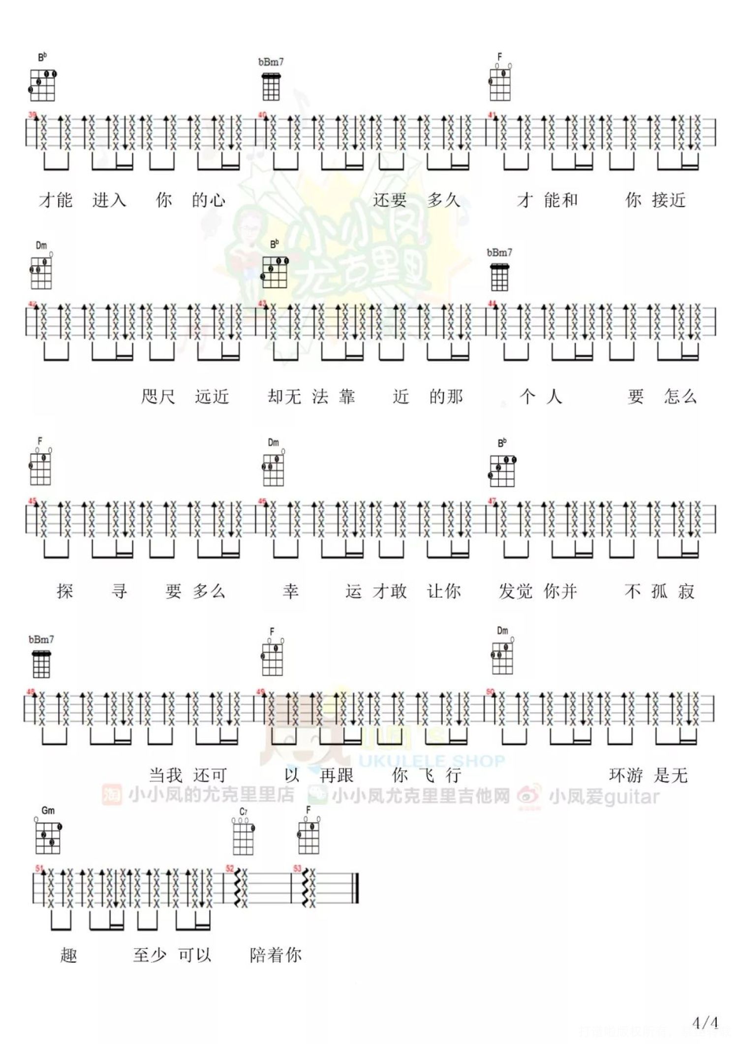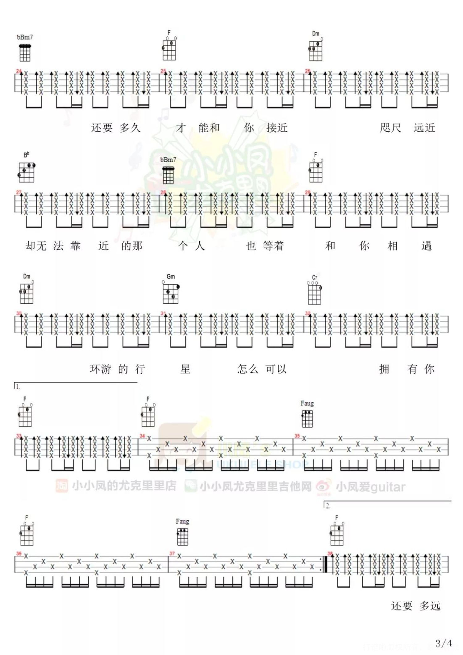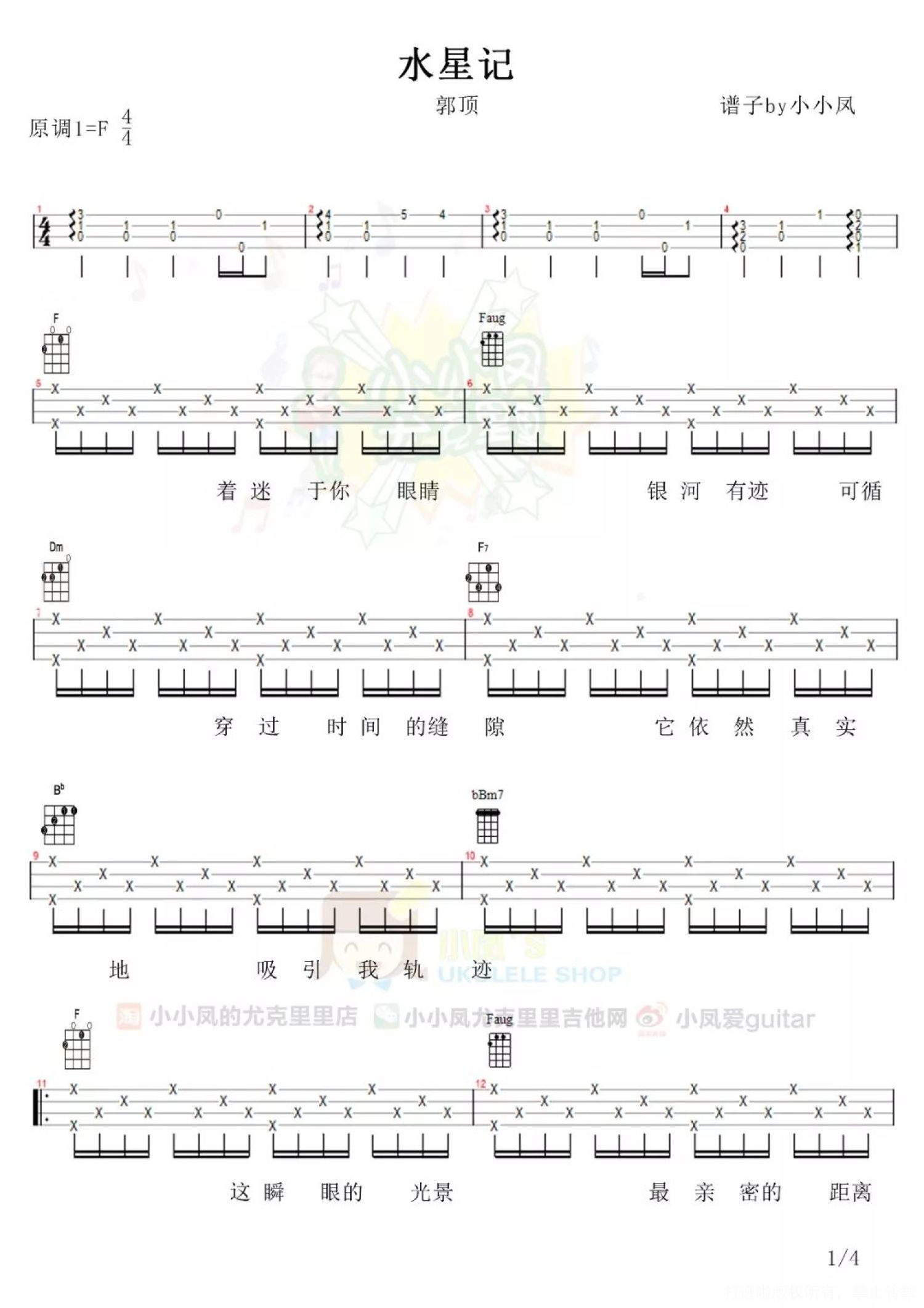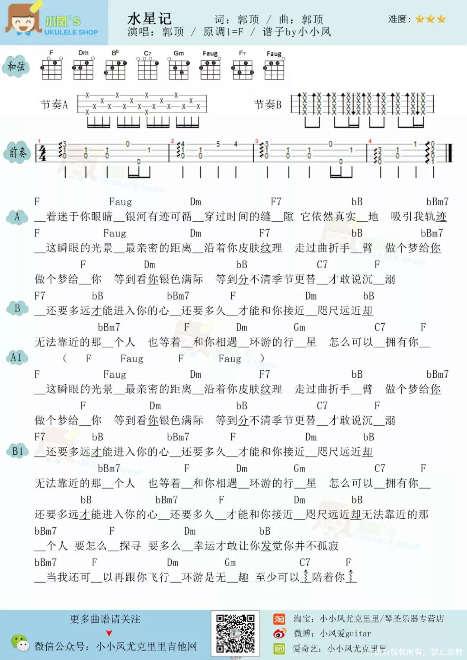 曲谱介绍: 《水星记》尤克里里弹唱谱   详谱: 在如今如此大压力,快节奏的生活下 我们整天围绕着学习、工作、生活四处奔波 很少有机会,可以静下来用心去听一首歌 用心去听音乐里的故事 今晚,我想跟大家分享一首 郭顶的<水星记> 这是一首需要安静聆听的歌 一首会一点一滴唱进你心里的歌 水星是太阳系独立的一颗行星 也是离太阳最近的星球,然而它却无法脱离自己的轨道,也无法接近太阳 从最初的想要去靠近 到最终的以遵循原有的轨道相伴运行 就如人与人之间 亦远亦近的情感关系那样 在现实的生活中,或许有一些人 是我们可望而不可及的,无论再怎么努力 然而,我们不甘心也不舍得就此离去 所以,我们选择在一旁静静陪伴 不管是躲在人群中悄悄注视他的背影 还是在朋友圈里只看动态而不去点赞 这都是我们陪伴的一种方式 或许有人会说 这种陪伴太苦涩、太卑微 但其实,能目睹在意的人快乐 不也是一种幸福吗 还要多远才能进入你的心 还要多久才能和你接近 咫尺远近却无法靠近的那个人 要怎么探寻 要多么幸运 才敢让你发觉你并不孤寂 当我还可以再跟你飞行 环游是无趣 至少可以.......陪着你