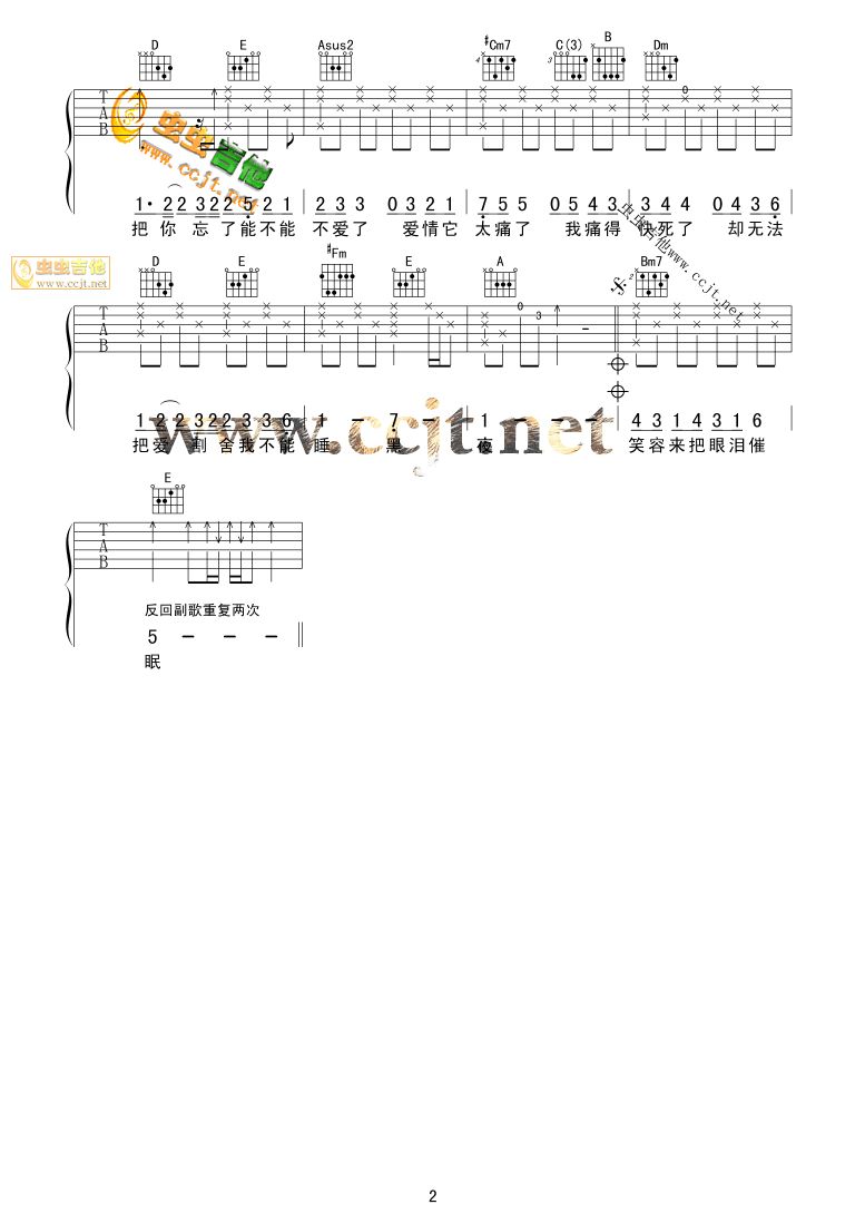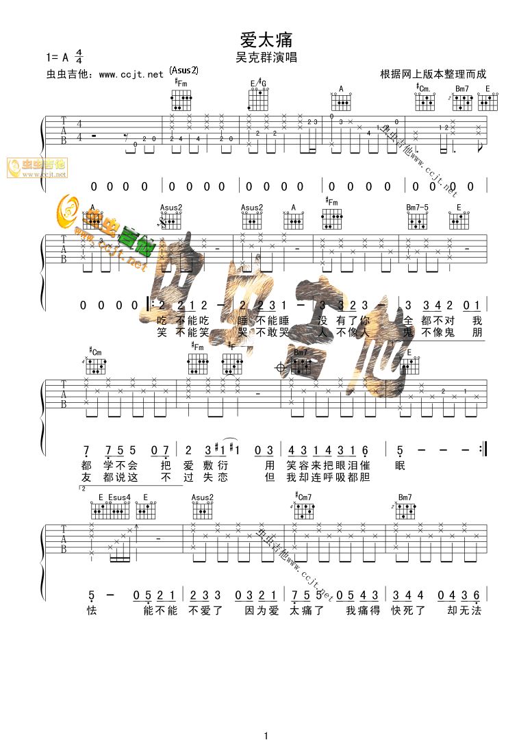 曲谱介绍: 《爱太痛》吉他谱,总共2张高清图片谱,选用A调,节拍4/4拍,不使用变调夹,弹唱难度初级。
