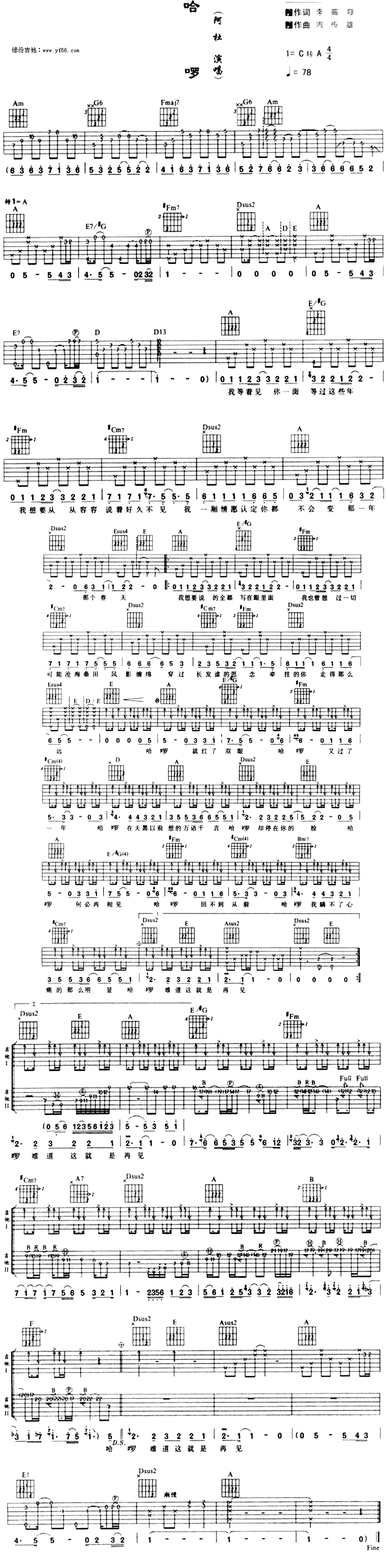 曲谱介绍: 阿杜《哈罗》吉他谱,总共1张高清图片谱,选用C调转A调,节拍4/4拍,速度每分钟78BPM,不使用变调夹,弹唱难度初级。