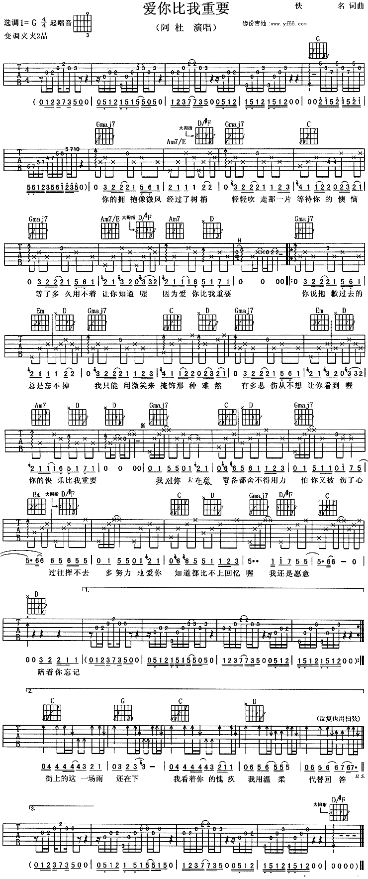 曲谱介绍: 《爱你比我重要》吉他谱,吉他谱,总共1张高清图片谱,选用G调,节拍4/4拍,建议使用变调夹夹2品,弹唱难度初级。