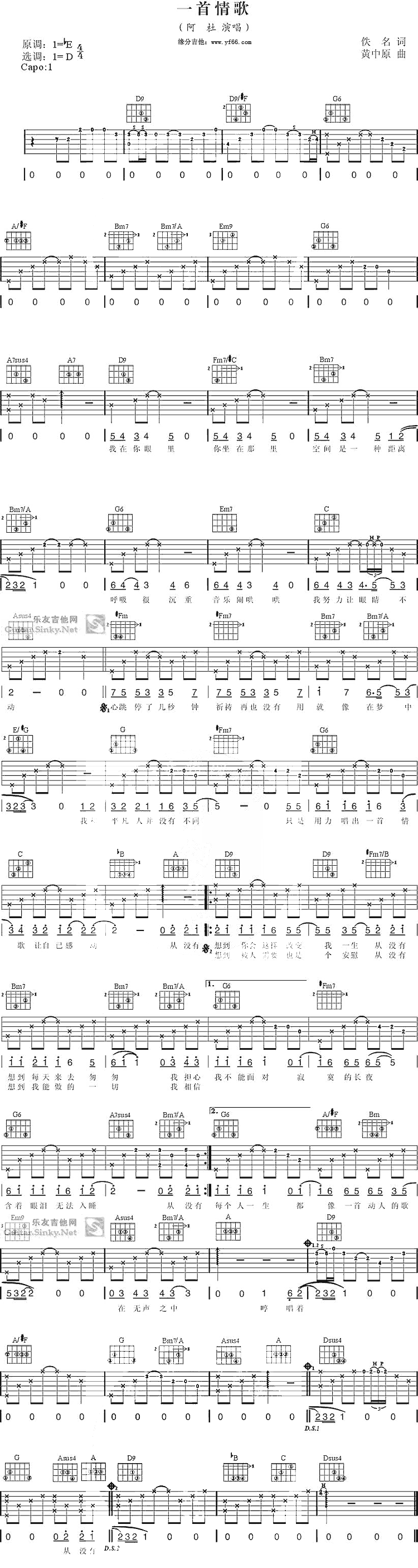 曲谱介绍: 《一首情歌》吉他谱,总共1张高清图片谱,原调为bE调,选用D调,节拍4/4拍,建议使用变调夹夹1品,弹唱难度初级。