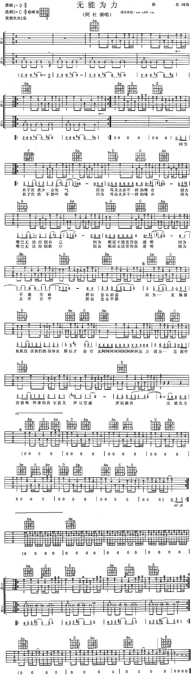 曲谱介绍: 《无能为力》吉他谱,总共1张高清图片谱,原调为D调,选用C调,节拍4/4拍,建议使用变调夹夹2品,弹唱难度初级。