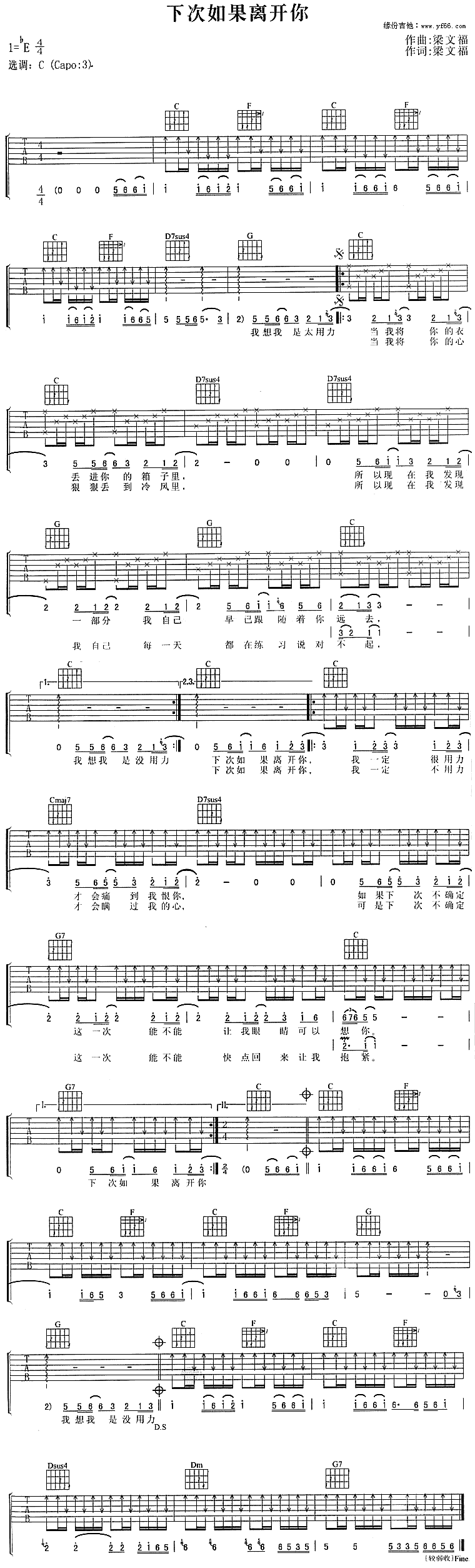 曲谱介绍: 《下次如果离开你》吉他谱,总共1张高清图片谱,原调为bE调,选用C调,节拍4/4拍,建议使用变调夹夹3品,弹唱难度初级。