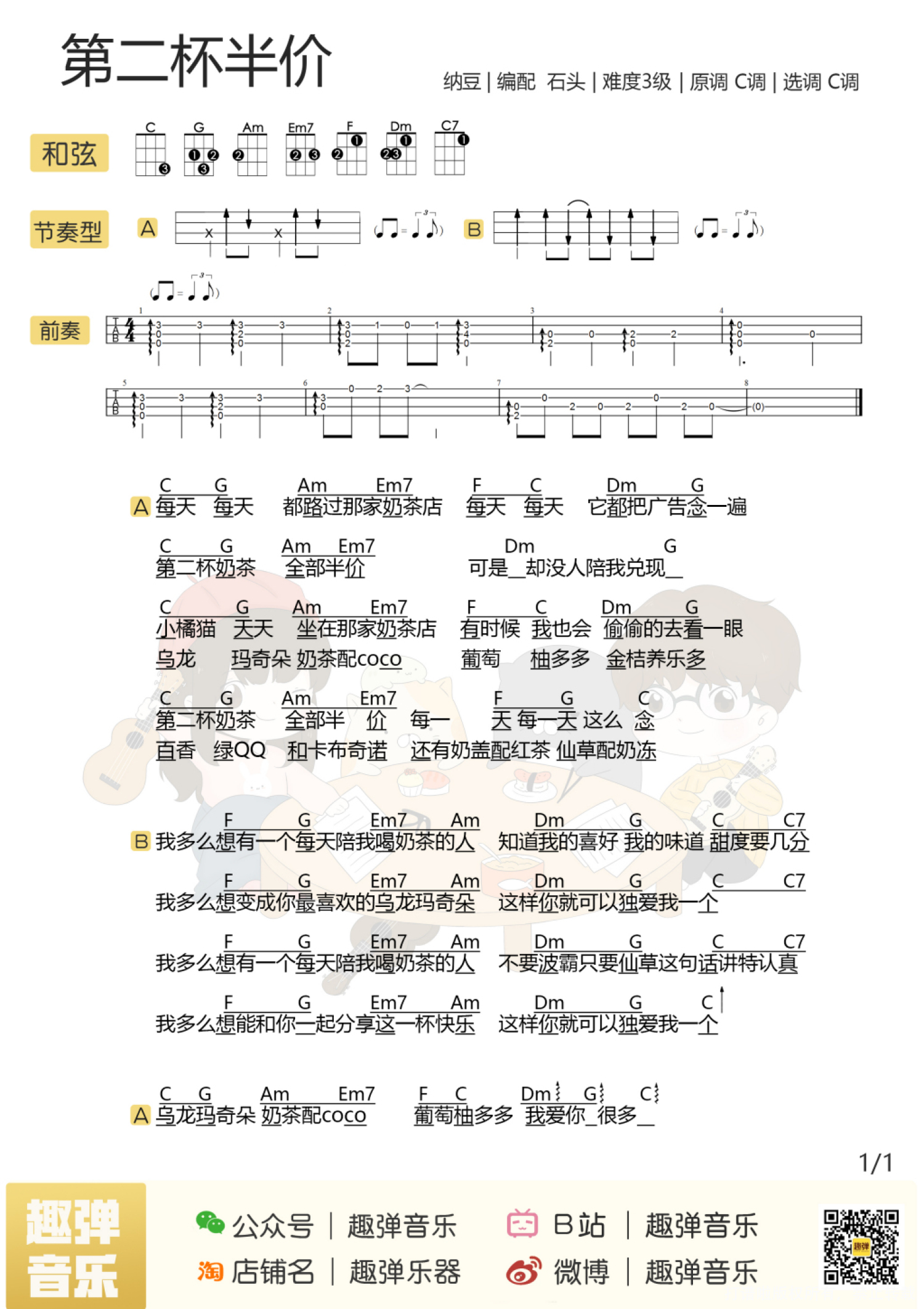 曲谱介绍: 《第二杯半价》尤克里里弹唱谱 纳豆为人古灵精怪,经常能做出些出乎意料的事,活脱脱的小仙女一枚。她还擅长讲段子,讲到兴起处时不拘小节的哈哈大笑,丝毫没有架子也很平易近人。 纳豆凭借着这样的性格获得了众多网友们的青睐,再加上她不凡的唱功,高低音转换自如的能力,成功跻身斗鱼七仙女的行列。