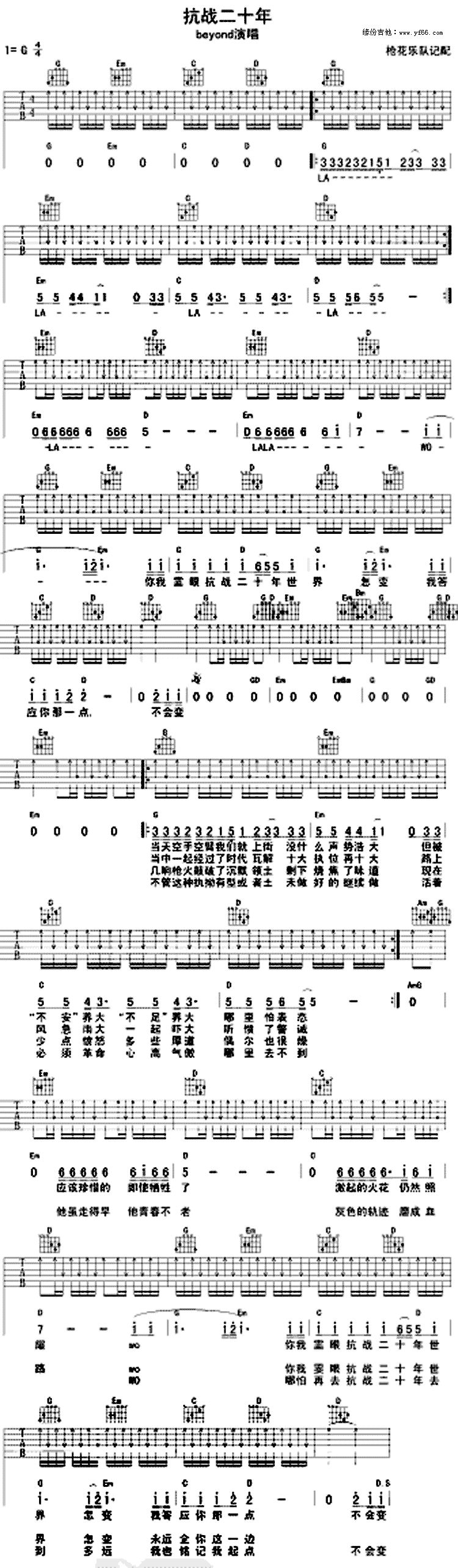 抗战二十年吉他谱 - Beyond - G调吉他弹唱谱