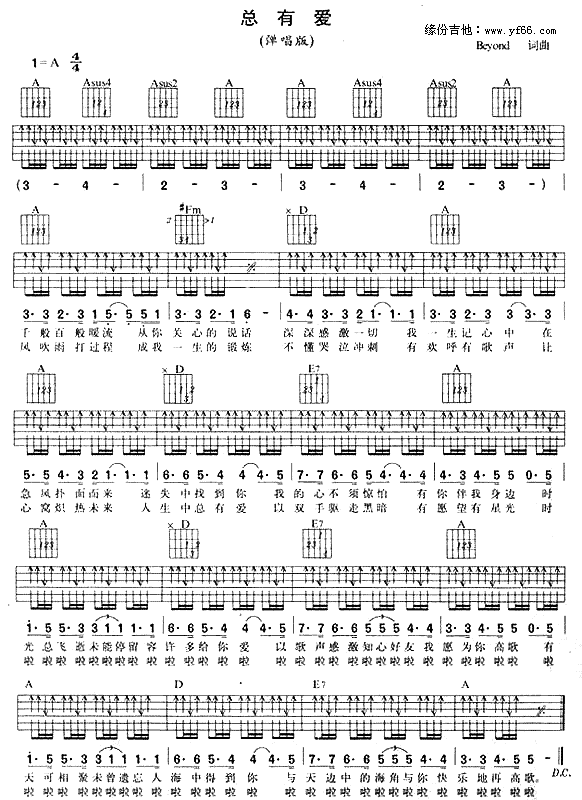 曲谱介绍: Beyond《总有爱》吉他谱,总共1张高清图片谱,选用A调,节拍4/4拍,不使用变调夹,弹唱难度初级。