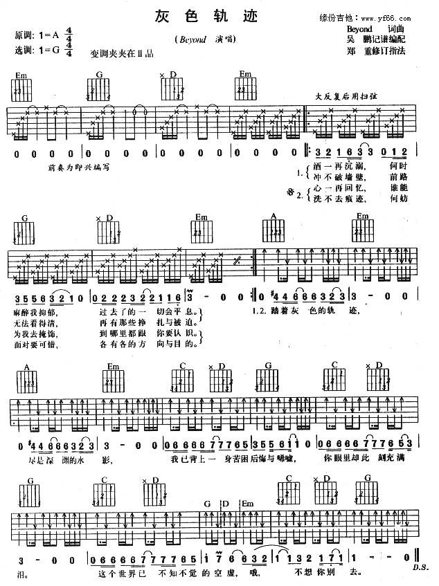 曲谱介绍: Beyond《灰色轨迹》吉他谱,总共1张高清图片谱,原调为A调,选用G调,节拍4/4拍,建议使用变调夹夹2品,弹唱难度初级。