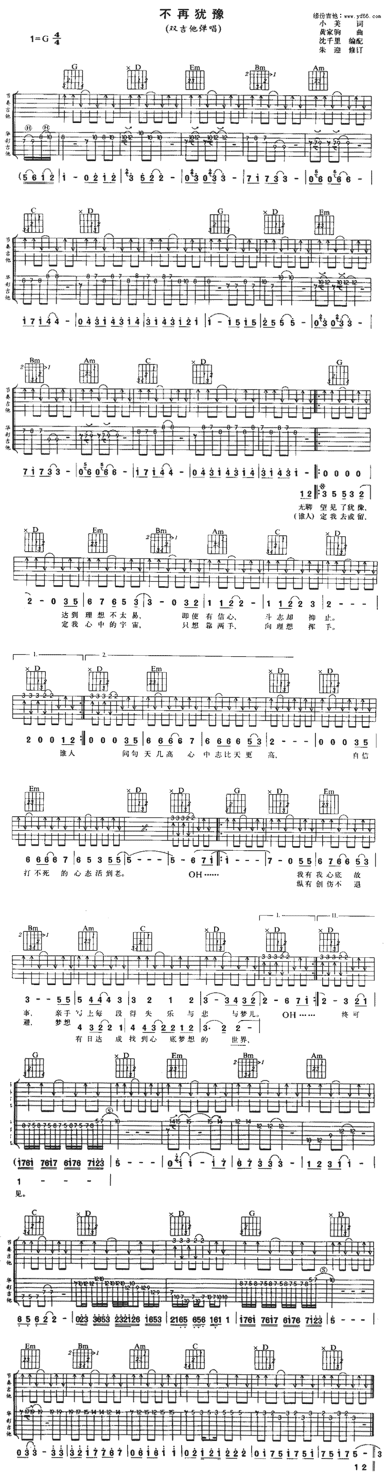 曲谱介绍: 《不再犹豫》吉他谱,由沈千里制谱编配,总共1张高清图片谱,G调指法吉他弹唱谱,标准调音可不用变调夹,本谱按双吉他版编配前奏/间奏/尾奏的solo部分,弹唱难度适中。