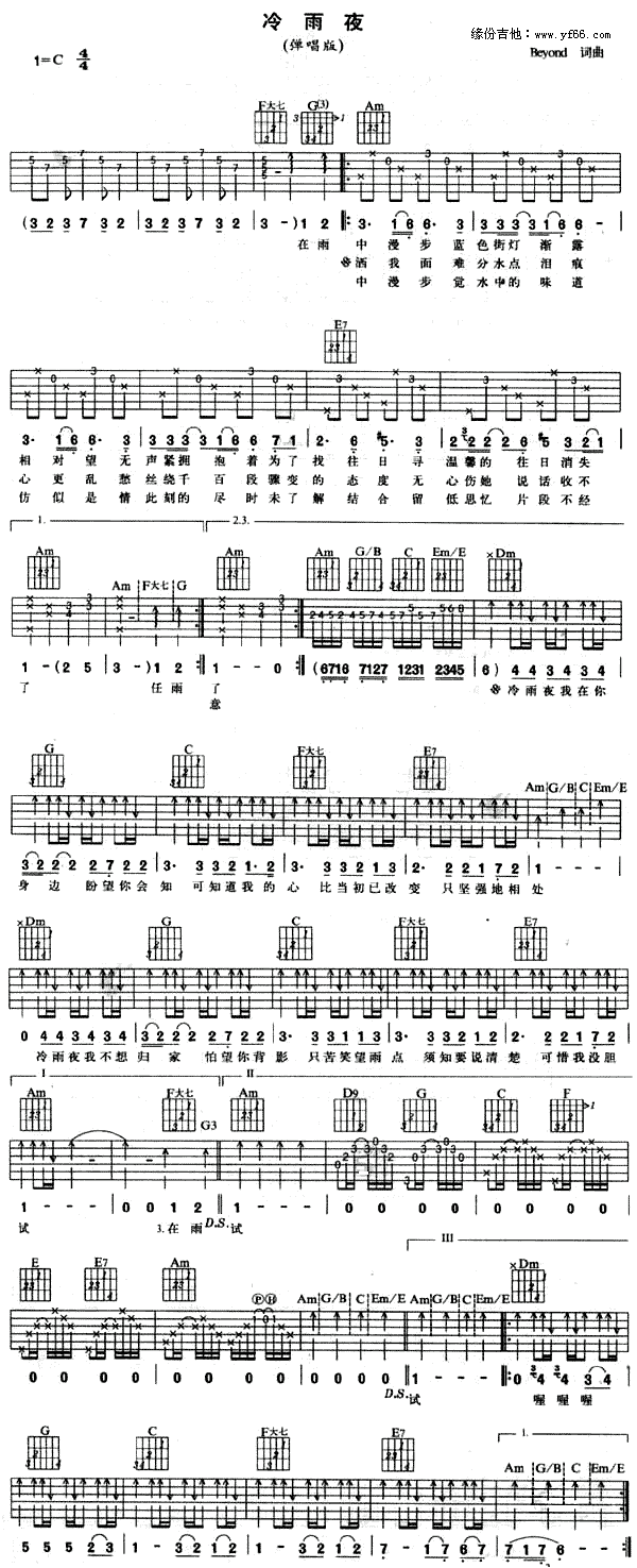 曲谱介绍: Beyond《冷雨夜》吉他谱,总共1张高清图片谱,选用C调,节拍4/4拍,不使用变调夹,弹唱难度初级。