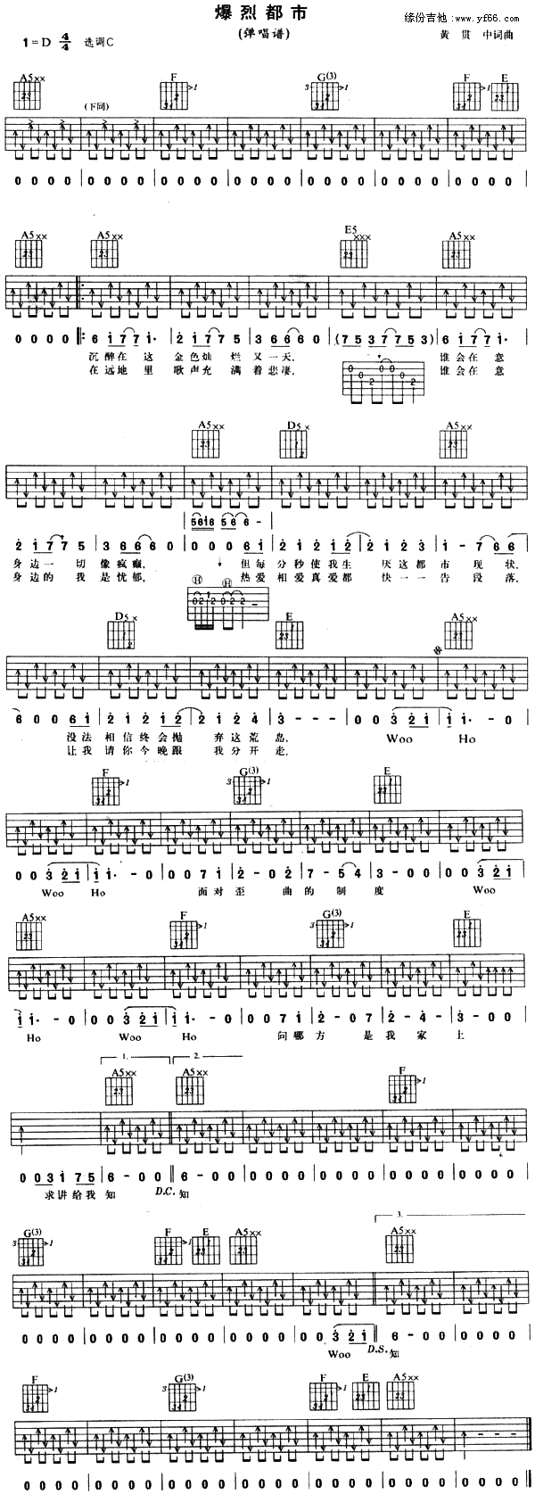 曲谱介绍: 《爆裂都市》吉他谱,总共1张高清图片谱,原调为D调,选用C调,节拍4/4拍,不使用变调夹,弹唱难度初级。