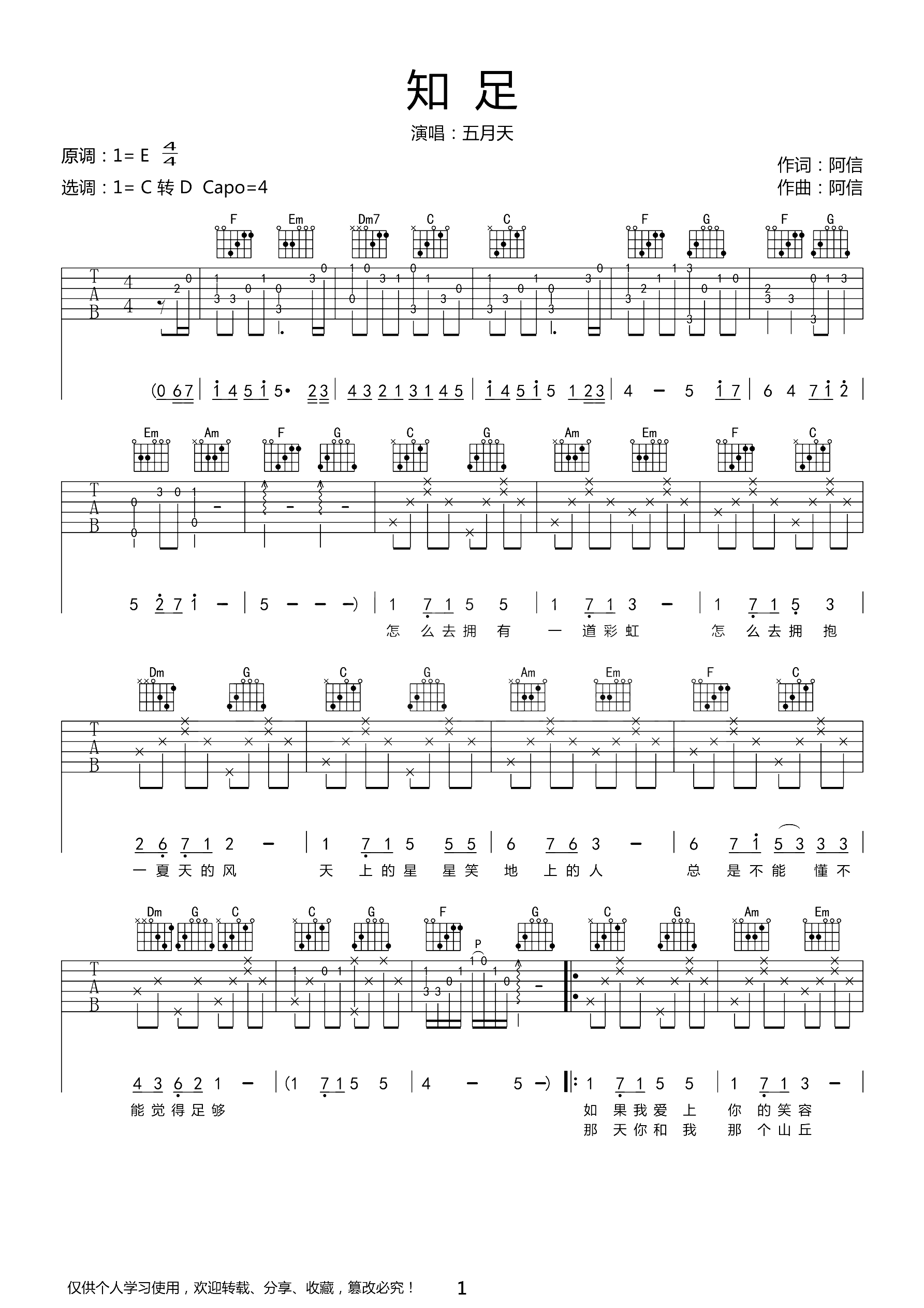 曲谱介绍: 五月天《知足》吉他谱【原版编配】,由17吉他制谱分享,选用C转D调指法编配,变调夹建议可夹4品弹唱原调E调,节奏4/4拍,弹唱难度较简单。
