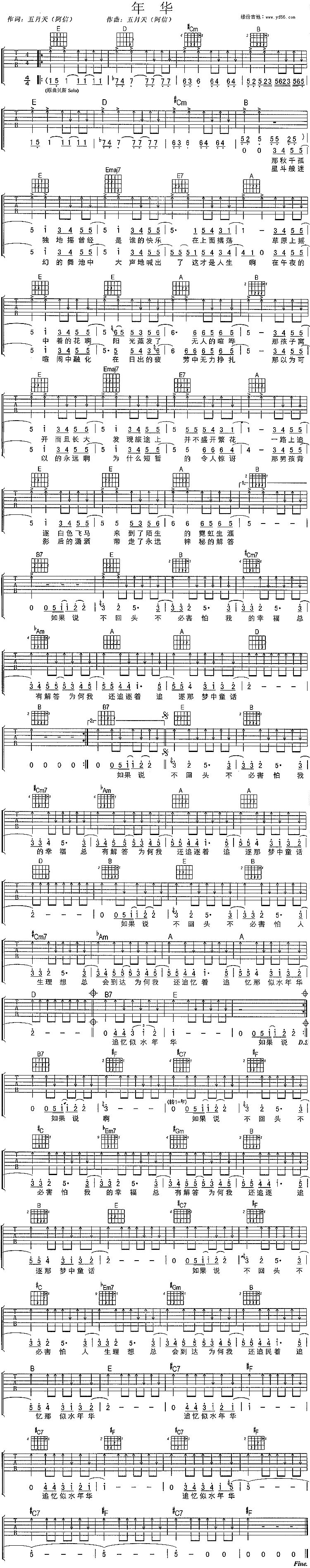 曲谱介绍: 五月天《年华》吉他谱,总共1张高清图片谱,不使用变调夹,弹唱难度初级。