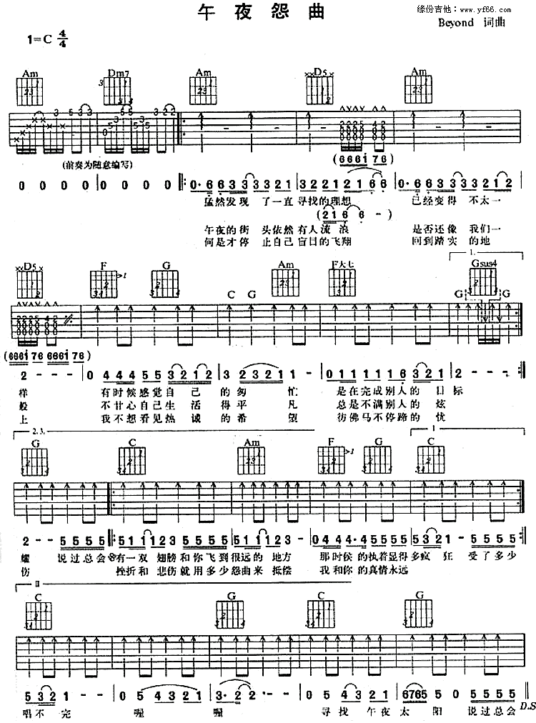 午夜怨曲吉他谱 - Beyond - C调吉他弹唱谱