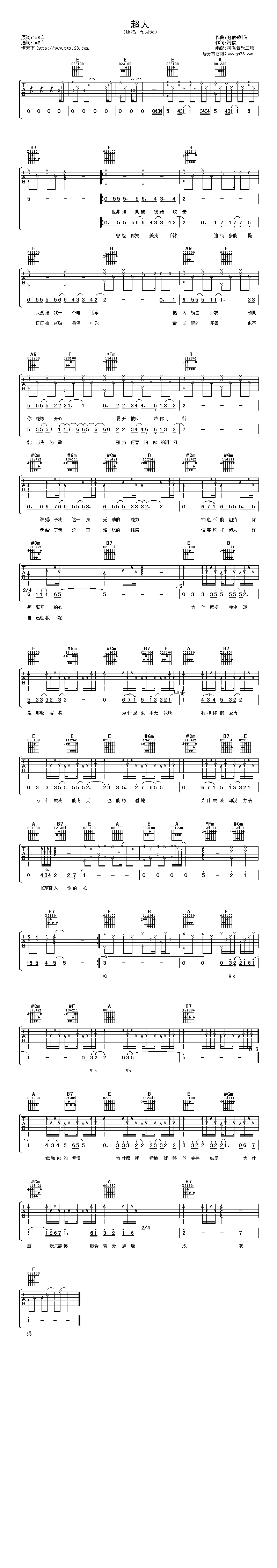 曲谱介绍: 五月天《超人》吉他谱,由阿潘音乐工场制谱,总共1张高清图片谱,原调为E调,选用E调,节拍4/4拍,不使用变调夹,弹唱难度初级。