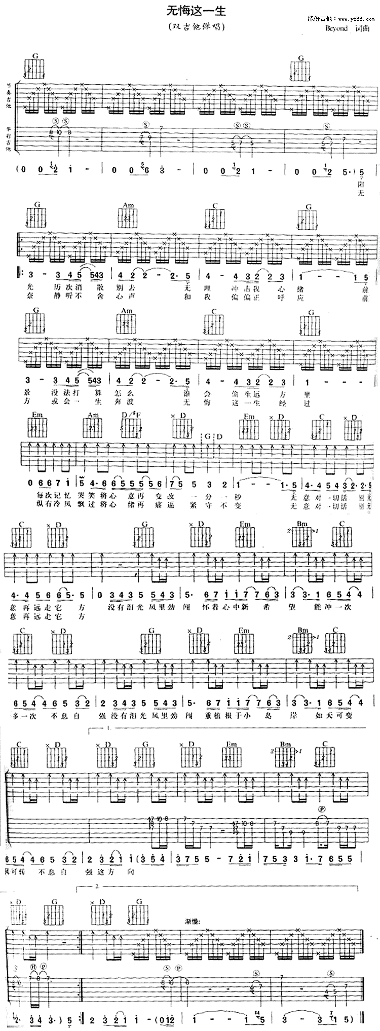 曲谱介绍: Beyond《无悔这一生》吉他谱,总共1张高清图片谱,不使用变调夹,弹唱难度初级。