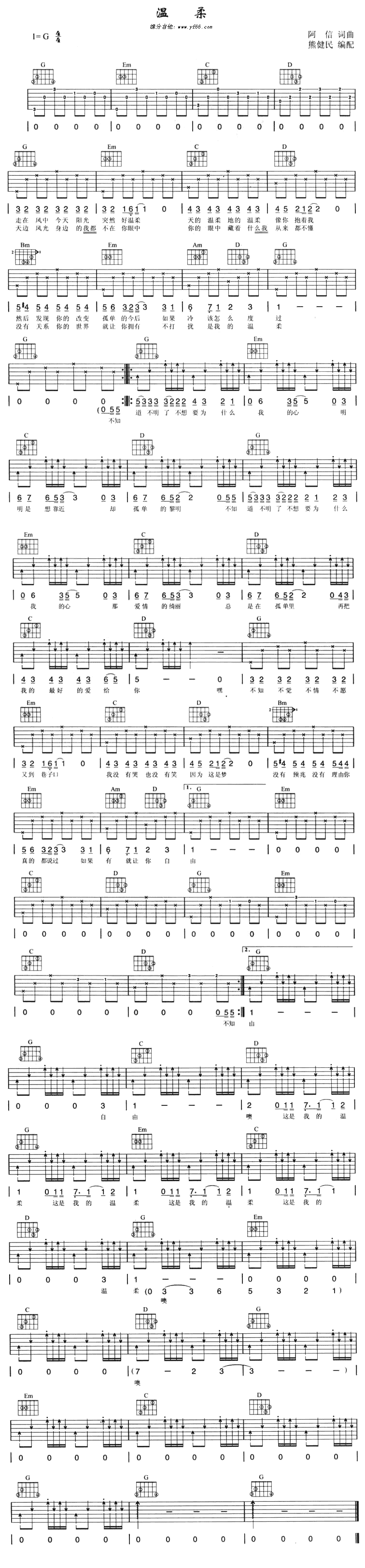 曲谱介绍: 五月天《温柔》吉他谱,总共1张高清图片谱,选用G调,节拍4/4拍,不使用变调夹,弹唱难度初级。
