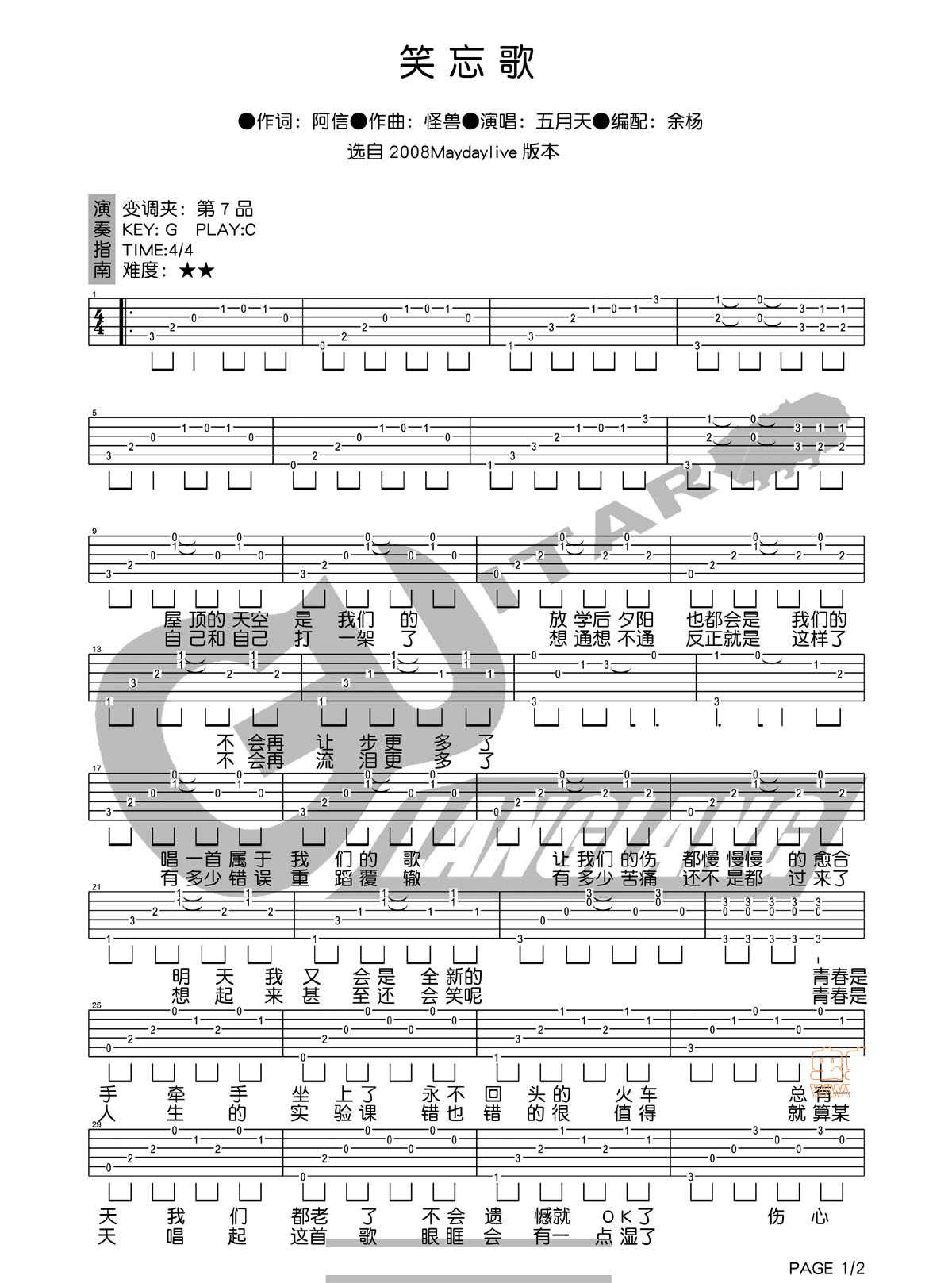 曲谱介绍: 《笑忘歌》吉他谱,总共2张高清图片谱,原调G调,选用C调,节拍4/4拍,建议使用变调夹夹7品,弹唱难度初级。
