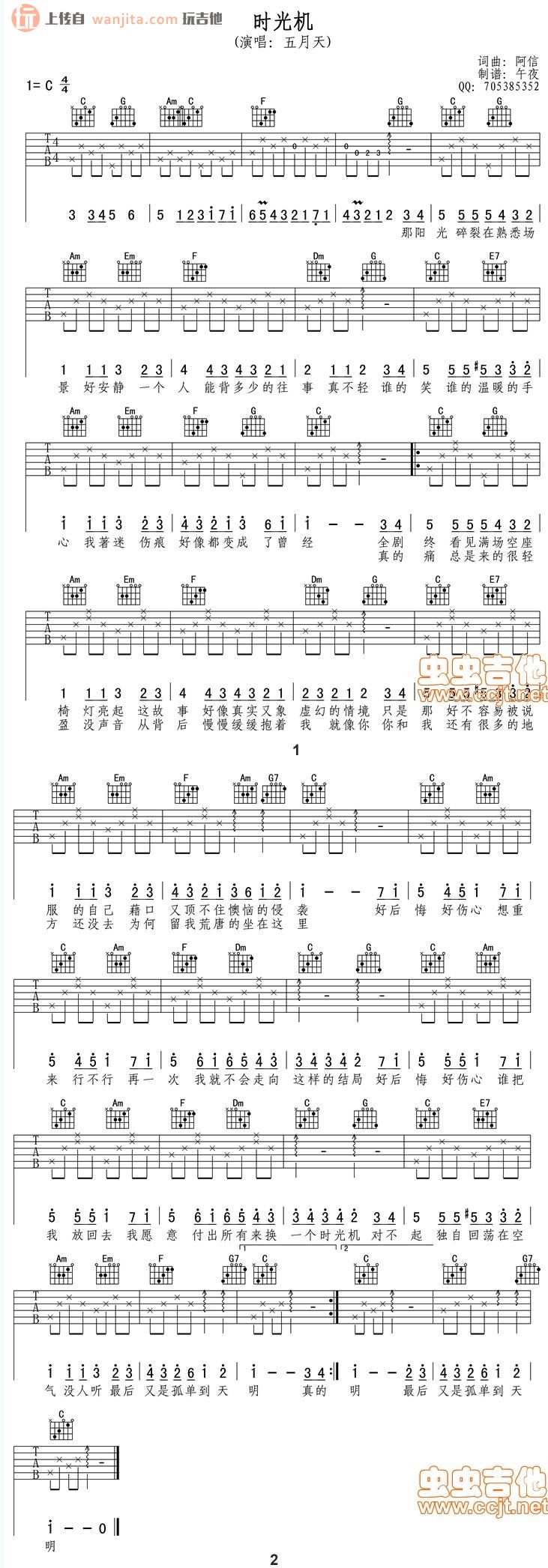 曲谱介绍: 《时光机》吉他谱,由午夜老师制谱,总共1张高清图片谱,选用C调,节拍4/4拍,不使用变调夹,弹唱难度初级。