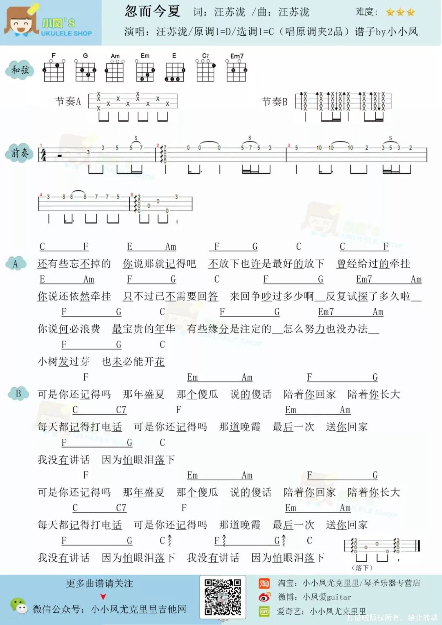 曲谱介绍: 《忽而今夏》尤克里里弹唱谱   祥谱: 不知不觉又到了盛夏 还记得当年你们那关于盛夏的故事吗 当年你们一转身 青春盛开了繁花 阳光下的林荫路,清风中的追逐 还有忽然间许下的永远诺言…... 但岁月一转身,忽而今夏 曾经我们一直静静看着同一张脸 感觉是那么讨人欢喜 但闹起来时,又感觉那么讨厌 时光永远也带不走那年那个夏天 它在生命里,有着像你我一样的人 虽然我们还有很多很多的夏天 但是没有一个会像那样的夏天 这首歌是今天热播电视剧<忽而今夏>的主题曲 汪苏泷用旋律歌声刻画下 贴近生活最熟悉最本真的爱情面貌 从纯真的萌芽,到现实的无奈 种种妥协与酸涩,不舍与牵挂 旋律单调感情却复杂 你我一转身 青春繁花 岁月一转身 忽而今夏 或许有些缘分是注定的 再怎么努力也没办法.....