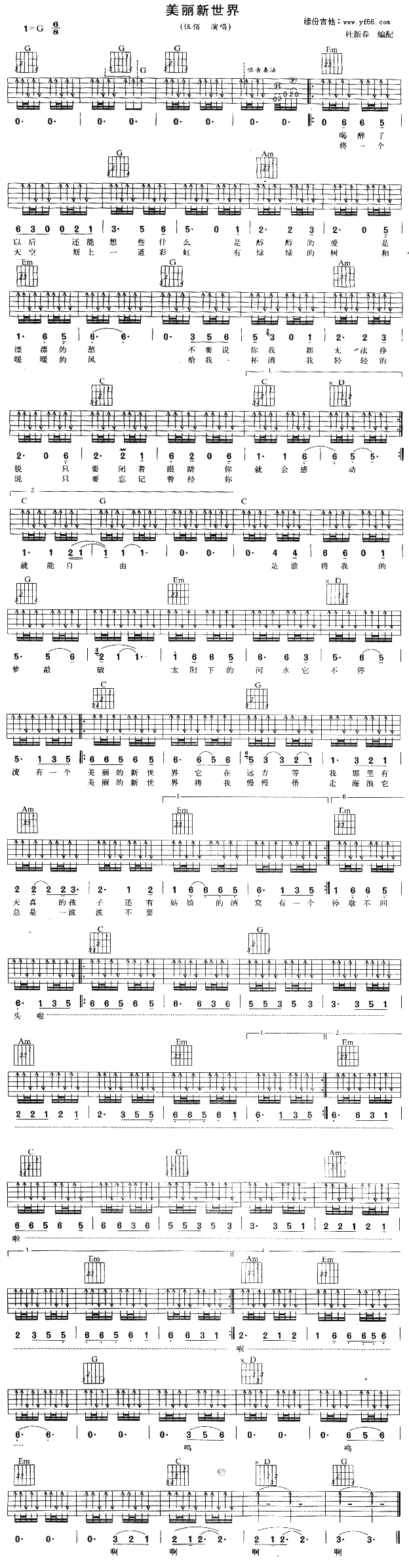 曲谱介绍: 《美丽新世界》吉他谱,总共1张高清图片谱,选用G调,节拍6/8拍,不使用变调夹,弹唱难度初级。