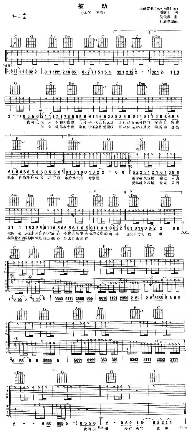 曲谱介绍: 伍佰《被动》吉他谱,总共1张高清图片谱,选用C调,节拍4/4拍,不使用变调夹,弹唱难度初级。