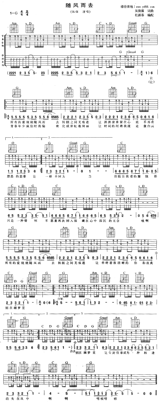 曲谱介绍: 《随风而去》吉他谱,总共1张高清图片谱,选用G调,节拍4/4拍,不使用变调夹,弹唱难度初级。