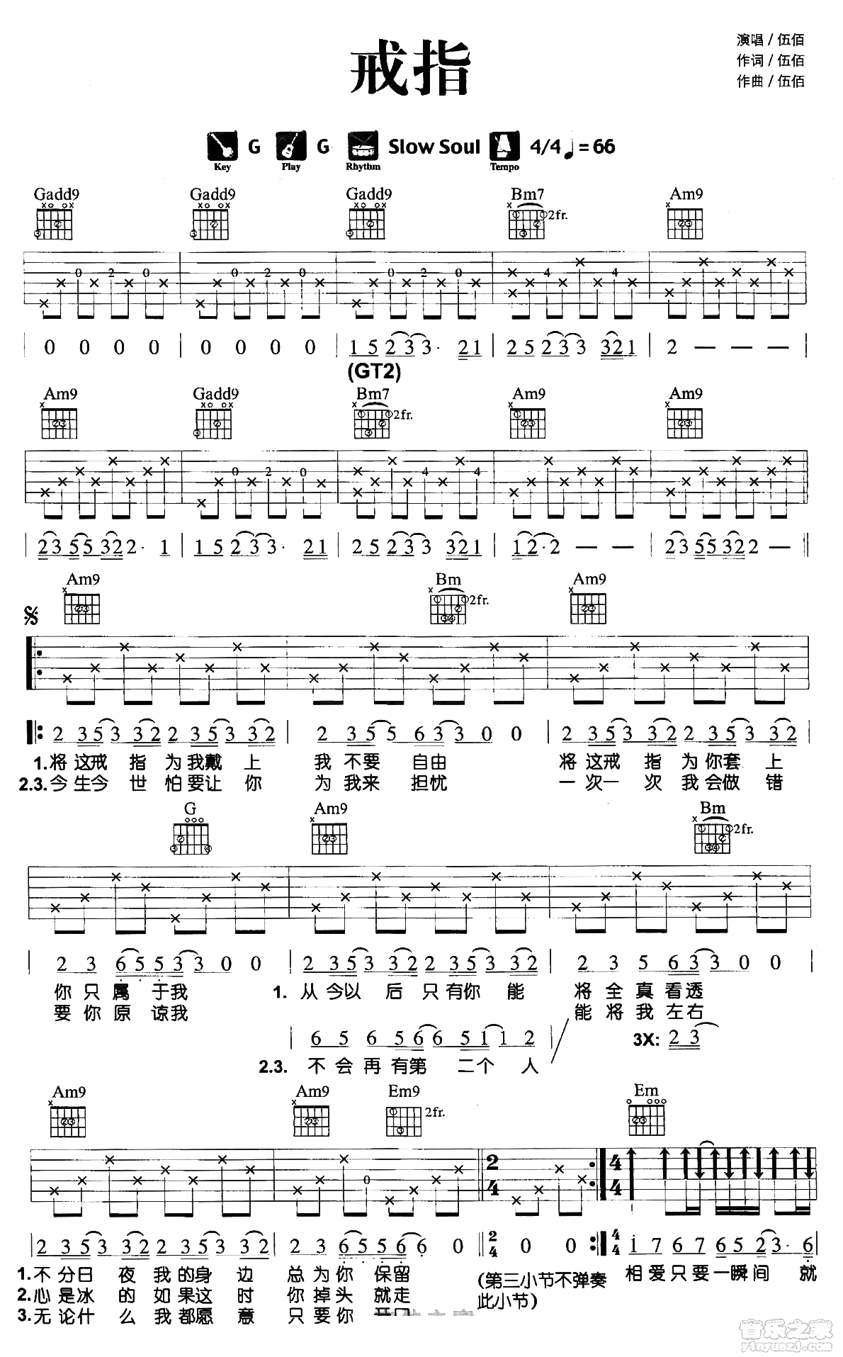 曲谱介绍: 伍佰《戒指》吉他谱,总共3张高清图片谱,原调为G调,选用G调,节拍4/4拍,不使用变调夹,弹唱难度初级。