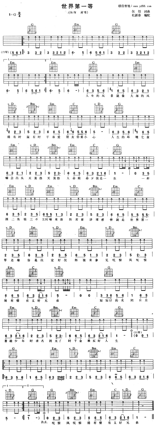 曲谱介绍: 伍佰《世界第一等》吉他谱,由杜新春老师编配制谱,总共1张高清图片谱,选用G调,节拍2/4拍,不使用变调夹,弹唱难度初级。