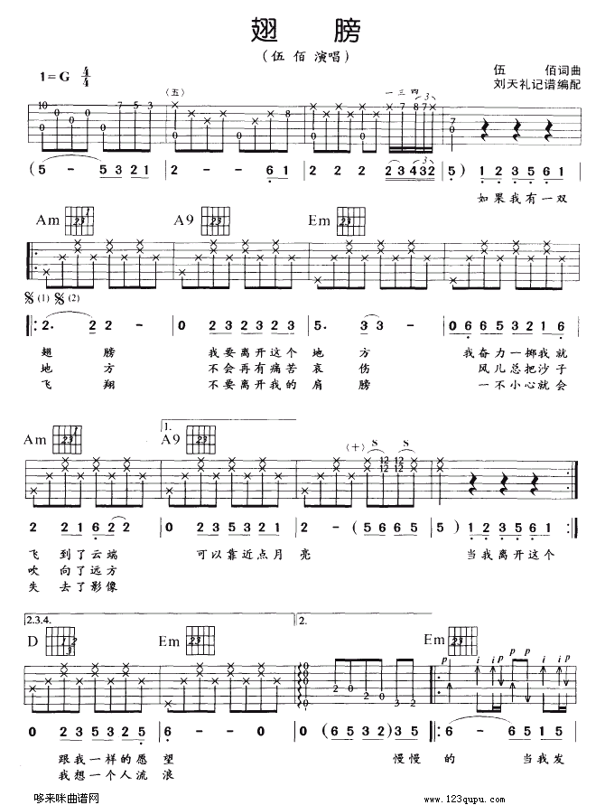 曲谱介绍: 伍佰《翅膀》吉他谱,由刘天礼老师编配制谱,总共2张高清图片谱,选用G调,节拍4/4拍,不使用变调夹,弹唱难度初级。