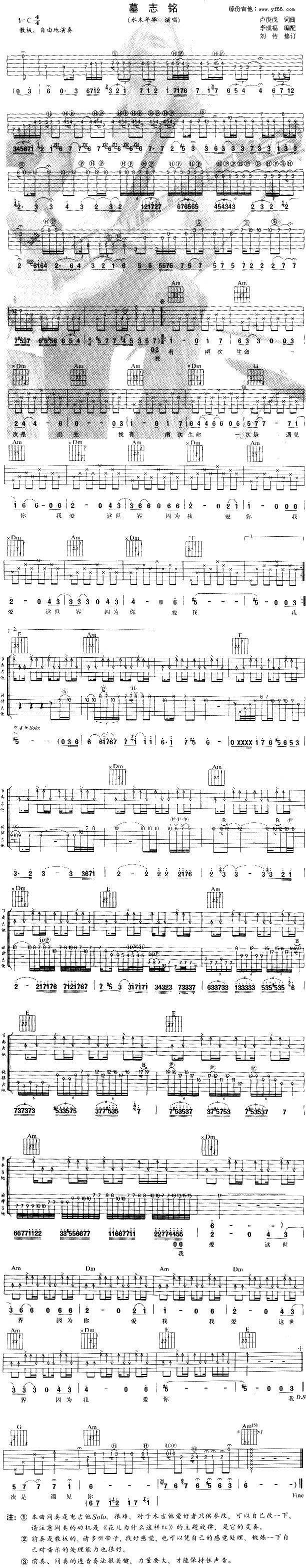 曲谱介绍: 《墓志铭》吉他谱,总共1张高清图片谱,选用C调,节拍4/4拍,不使用变调夹,弹唱难度初级。
