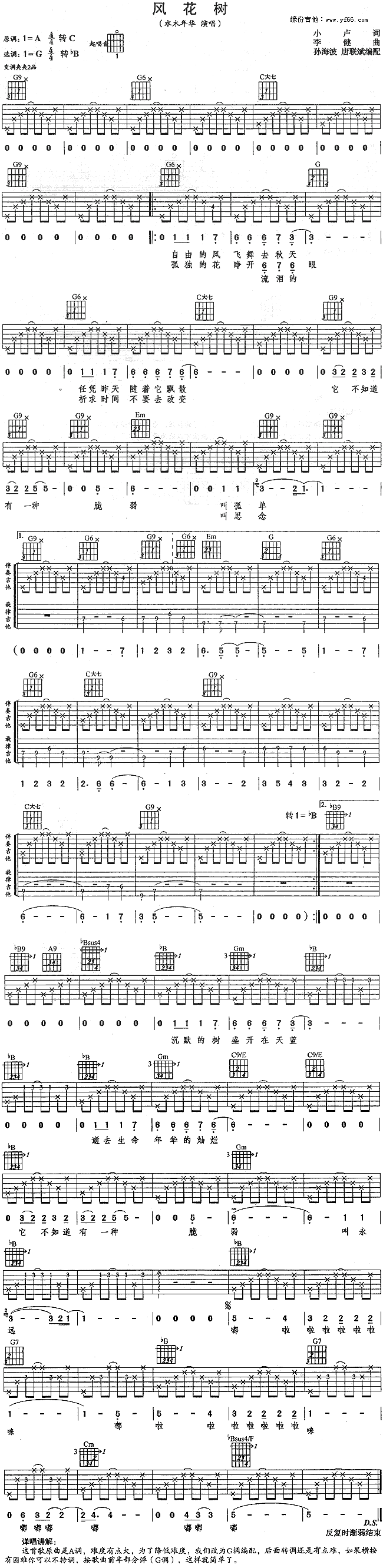 曲谱介绍: 水木年华《风花树》吉他谱,总共1张高清图片谱,原调A调转C调,选用G调转bB调,节拍4/4拍,建议使用变调夹夹二品,弹唱难度初级。