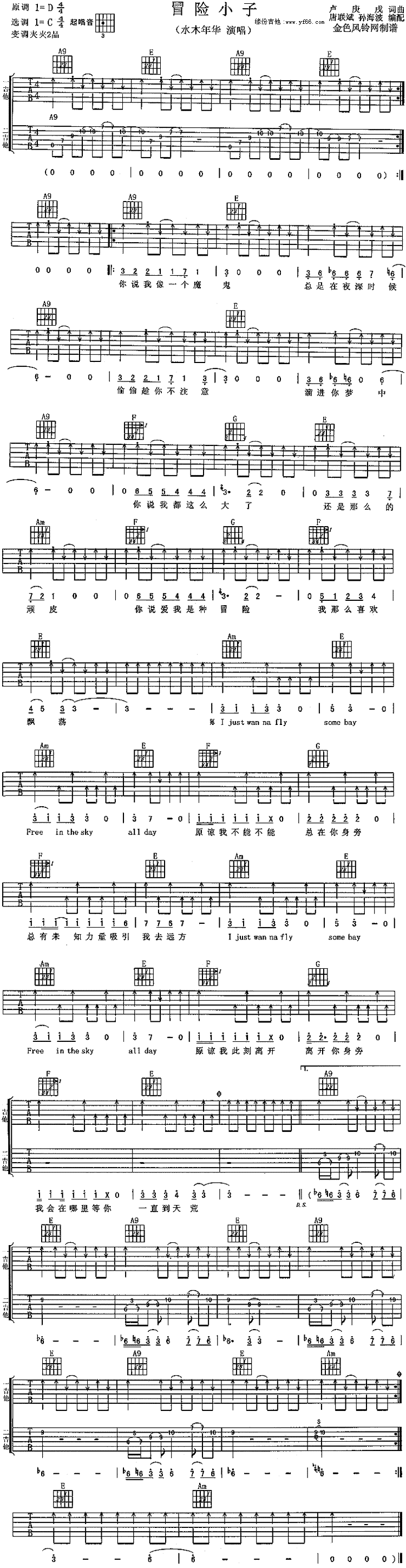 曲谱介绍: 水木年华《冒险小子》吉他谱,总共1张高清图片谱,原调D调,选用C调,节拍4/4拍,建议使用变调夹夹2品,弹唱难度初级。