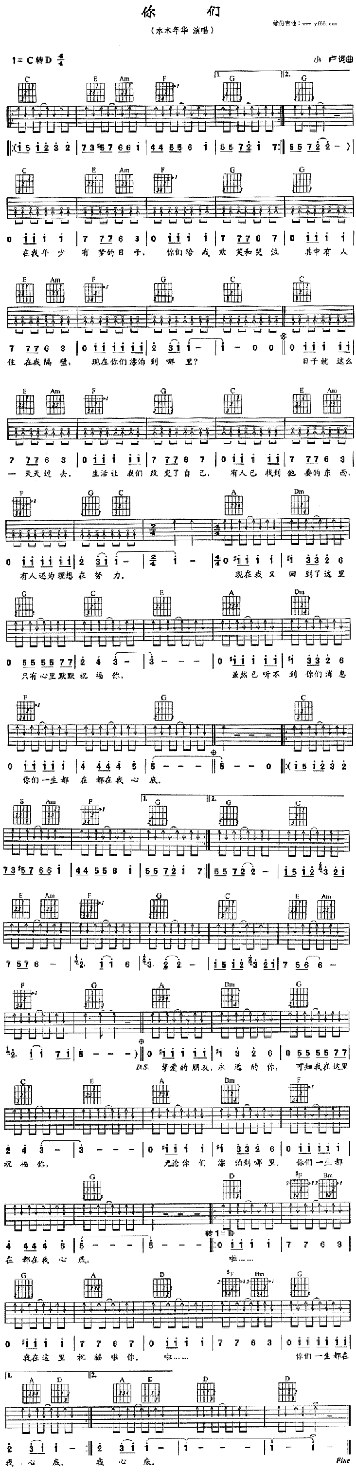 曲谱介绍: 水木年华《你们》吉他谱,总共1张高清图片谱,选用C调转D调,节拍4/4拍,不使用变调夹,弹唱难度初级。