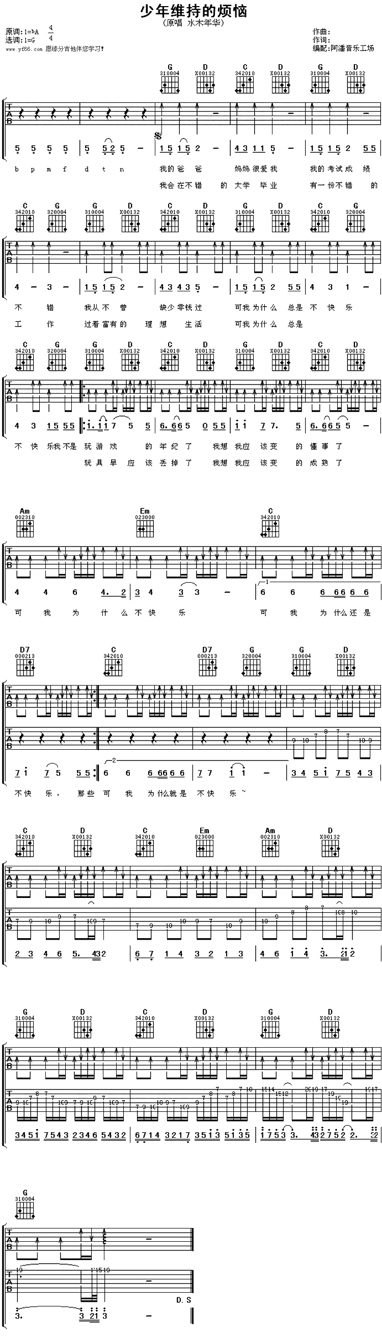 曲谱介绍: 《少年维持的烦恼》吉他谱,总共1张高清图片谱,原调bA调,选用G调,节拍4/4拍,不使用变调夹,弹唱难度初级。