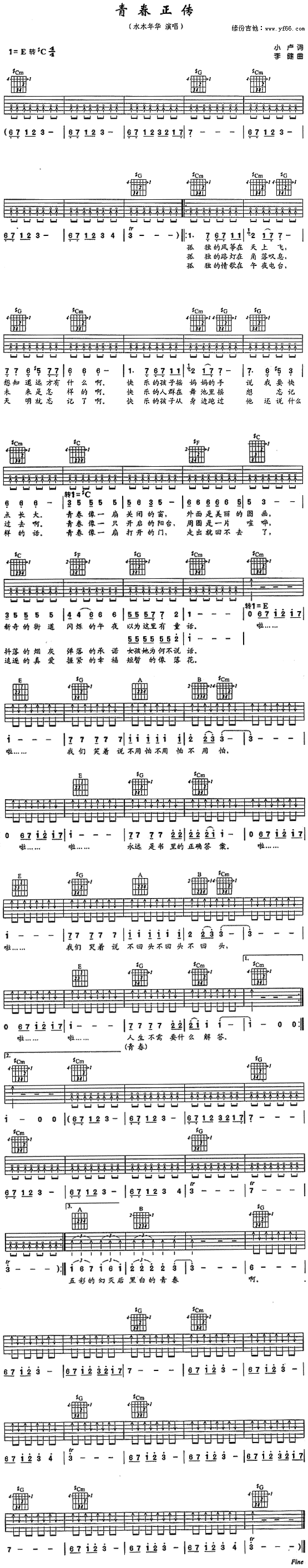 曲谱介绍: 《青春正传》吉他谱,总共1张高清图片谱,选用E调转#C调,节拍4/4拍,不使用变调夹,弹唱难度初级。