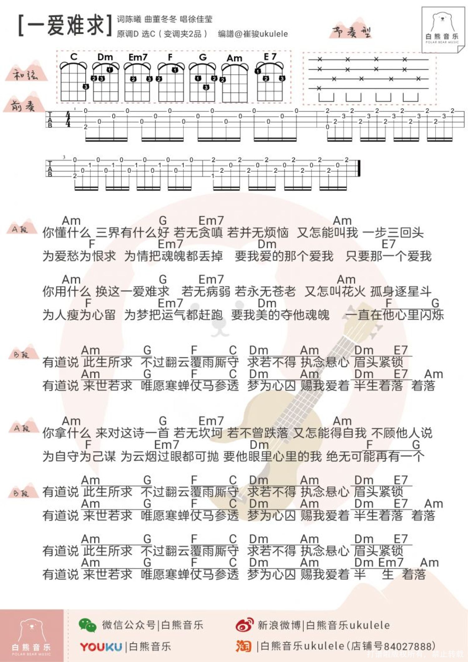 曲谱介绍: 《一爱难求》尤克里里弹唱谱