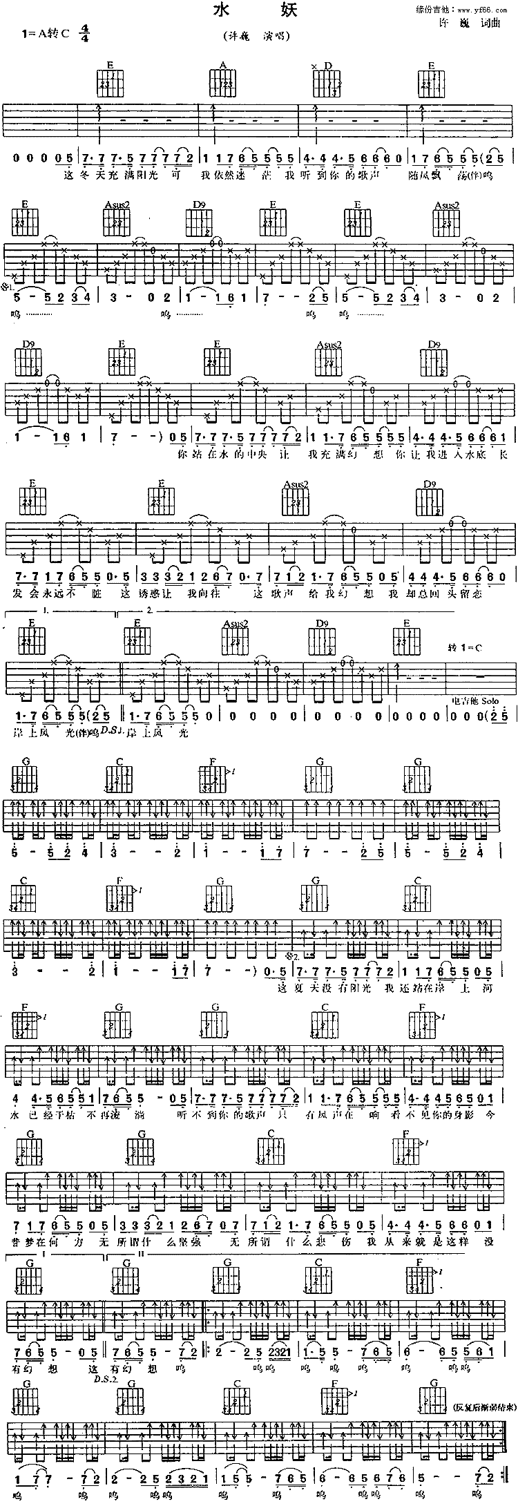 曲谱介绍: 《水妖》吉他谱,总共2张高清图片谱,选用A调转C调,节拍4/4拍,不使用变调夹,弹唱难度初级。