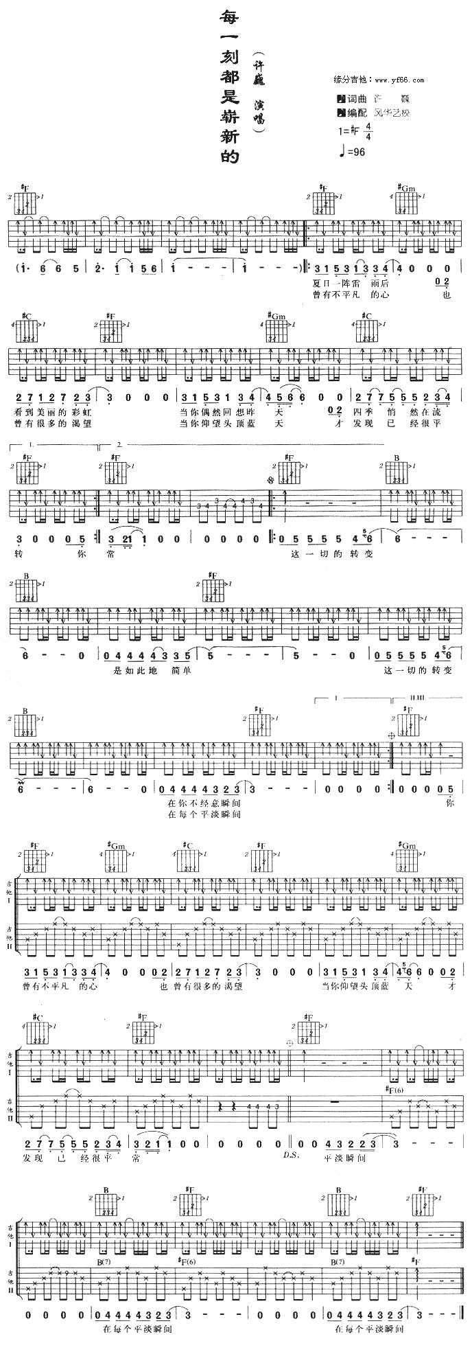 曲谱介绍: 《每一刻都是崭新的》吉他谱,总共1张高清图片谱,选用#F调,速度每分钟96BPM,节拍4/4拍,不使用变调夹,弹唱难度初级。