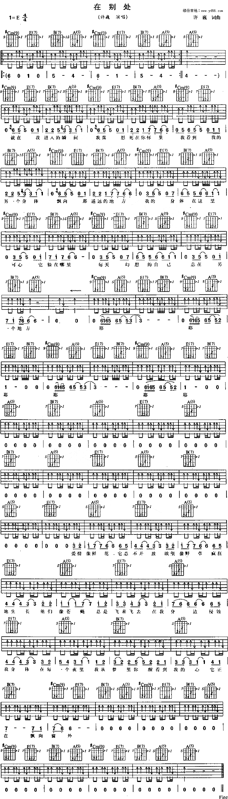 在别处吉他谱 - 许巍 - E调吉他弹唱谱