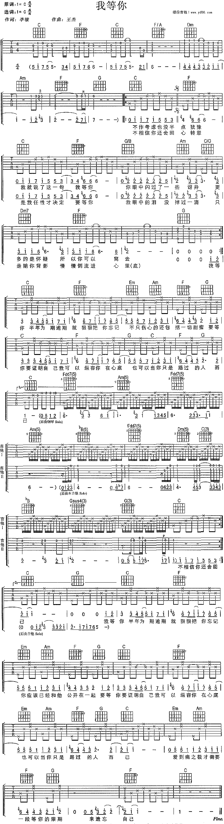 我等你吉他谱 - 王杰 - 吉他弹唱谱