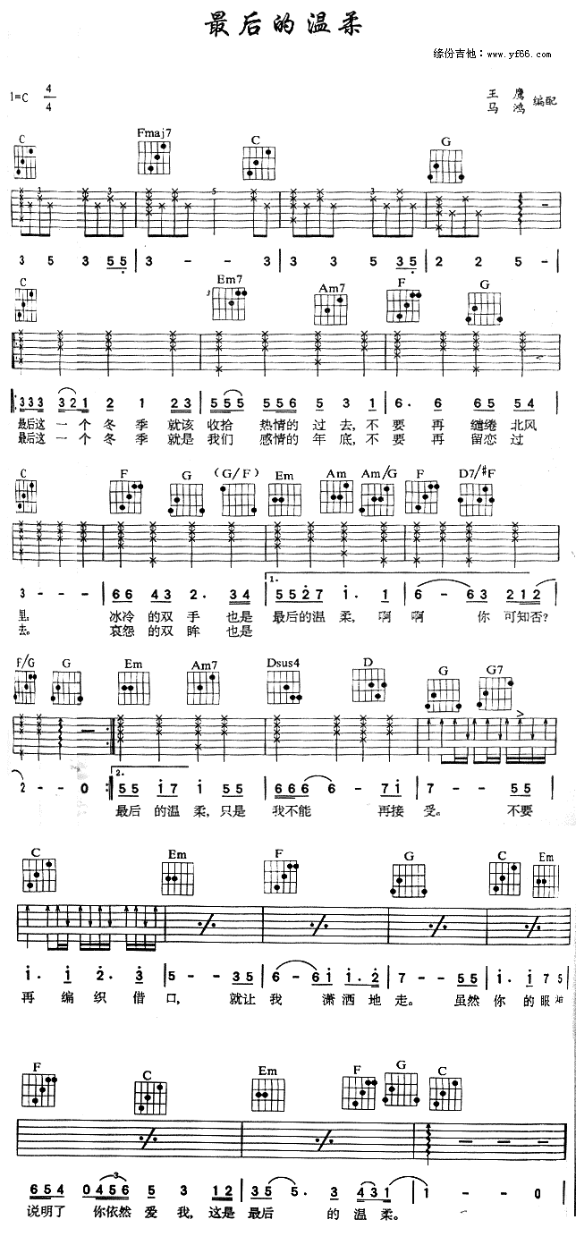曲谱介绍: 《最后的温柔》吉他谱,总共1张高清图片谱,选用C调,节拍4/4拍,不使用变调夹,弹唱难度初级。
