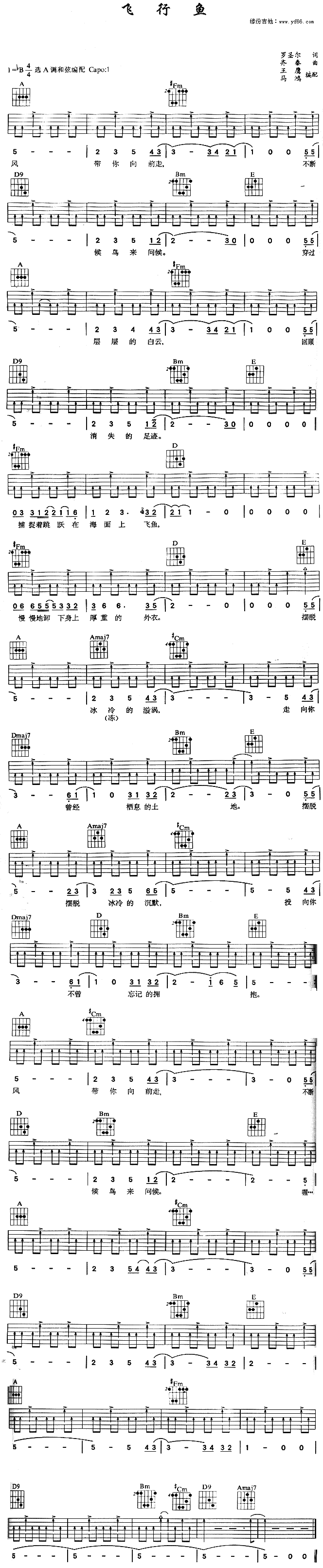 曲谱介绍: 《飞行鱼》吉他谱,总共1张高清图片谱,原调为bB调,选用A调和弦编配,节拍4/4拍,建议使用变调夹夹一品,弹唱难度初级。