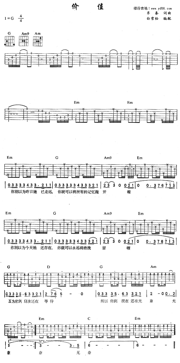 曲谱介绍: 《价值》吉他谱,总共1张高清图片谱,选用G调,节拍4/4拍,不使用变调夹,弹唱难度初级。