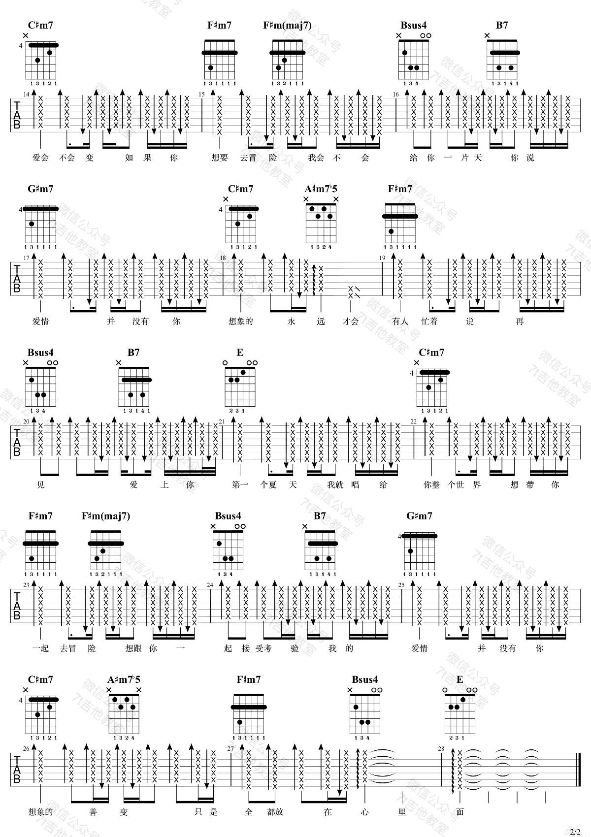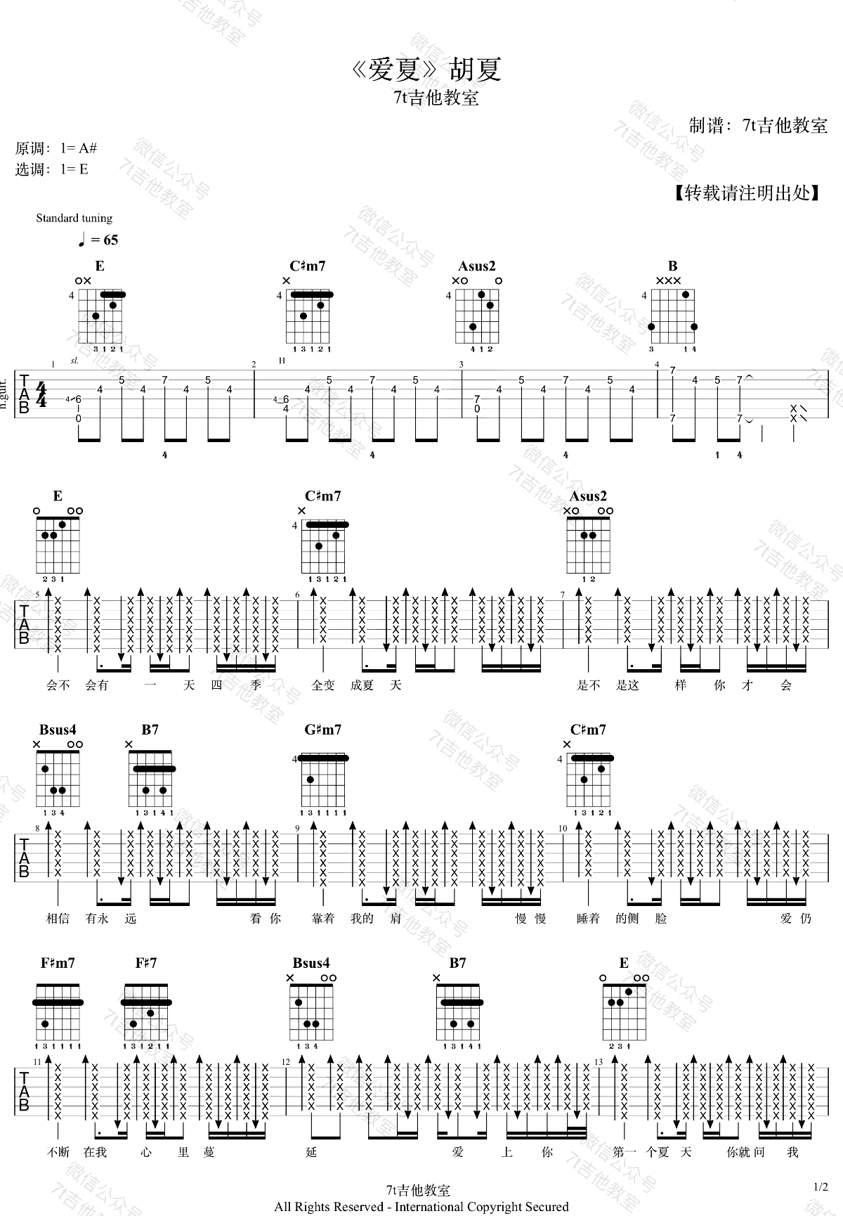曲谱介绍: 爱夏吉他谱E调完美原版六线谱以及教学分享,《爱夏》是由胡夏演唱的一首歌,胡夏的声音干净透彻,旋律及质感透露出一丝丝甜美的感觉。此版本的曲谱及教学来源于7T吉他教室扒谱制谱,歌曲原调为#A调,这里采用E调指法根据原版进行编配,演唱时夹变调夹6品即可回到原调。E调指法编配,和弦都比较难按,所以曲谱有一定难度,不懂可以参考视频。 《爱夏》吉他弹唱教学视频