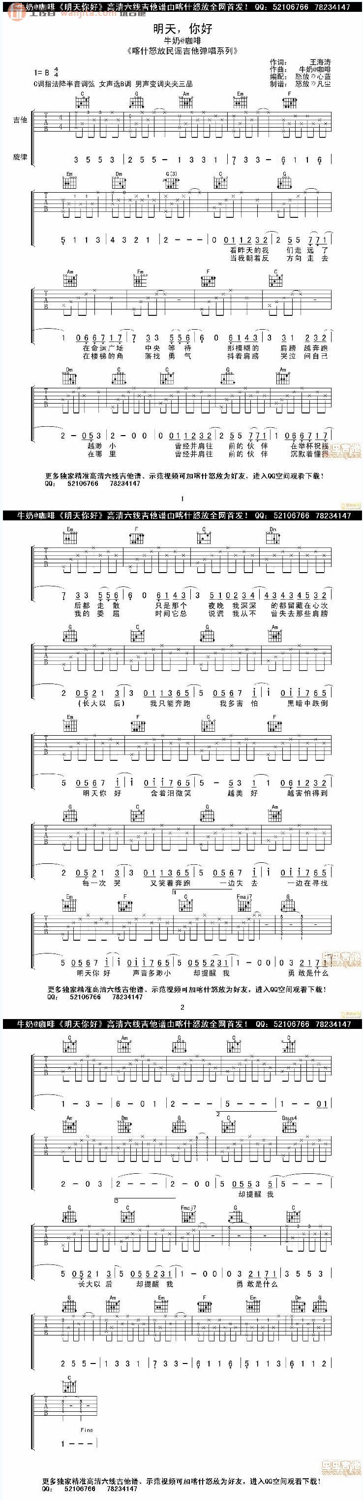 曲谱介绍: 明天你好吉他谱选用B调编配,C调指法降半音调弦,女声则选择B调即可,男声变调夹夹在3品