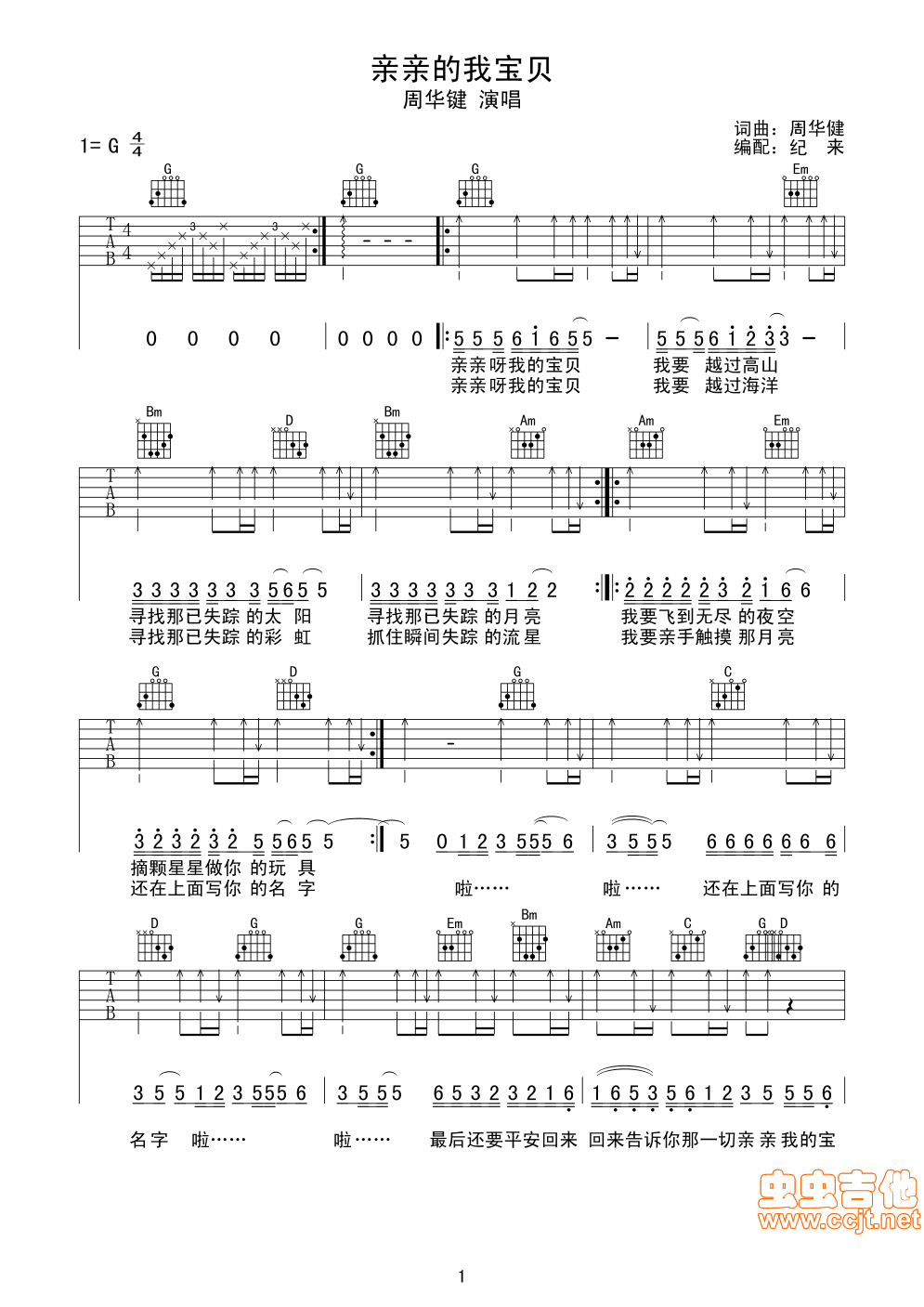 曲谱介绍: 《亲亲我的宝贝》吉他谱,选用G调,扫弦弹唱,难度不大,会扫弦的新手也可很好弹唱!