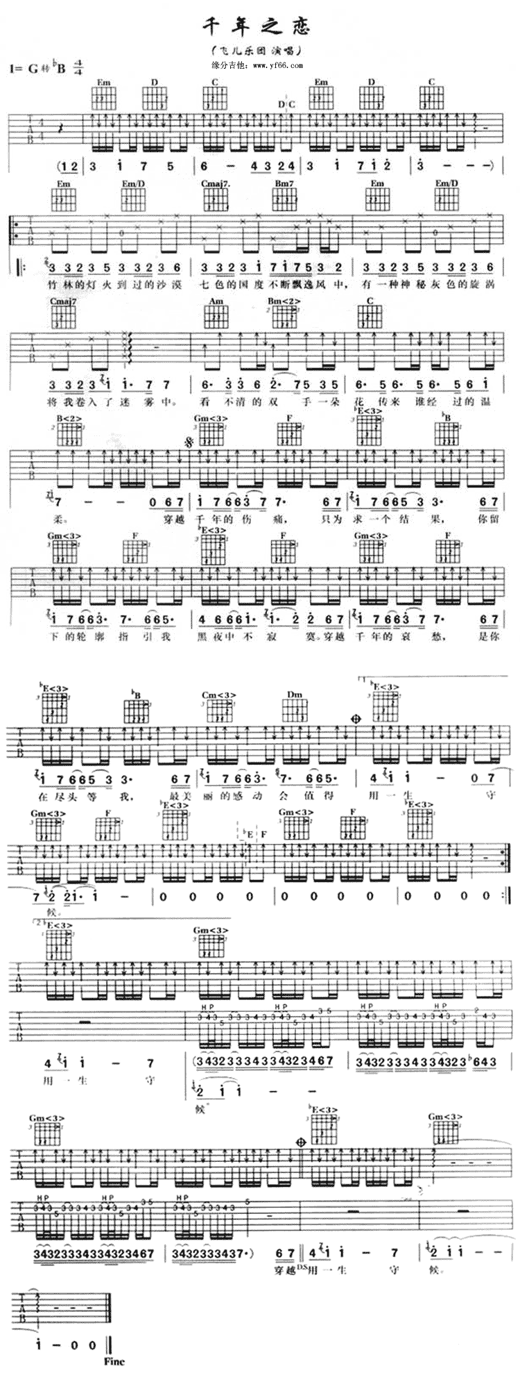 曲谱介绍: 千年之恋吉他谱,是飞儿的以后经典歌曲,节奏律动感较强,本谱选用的G转降B调编配。
