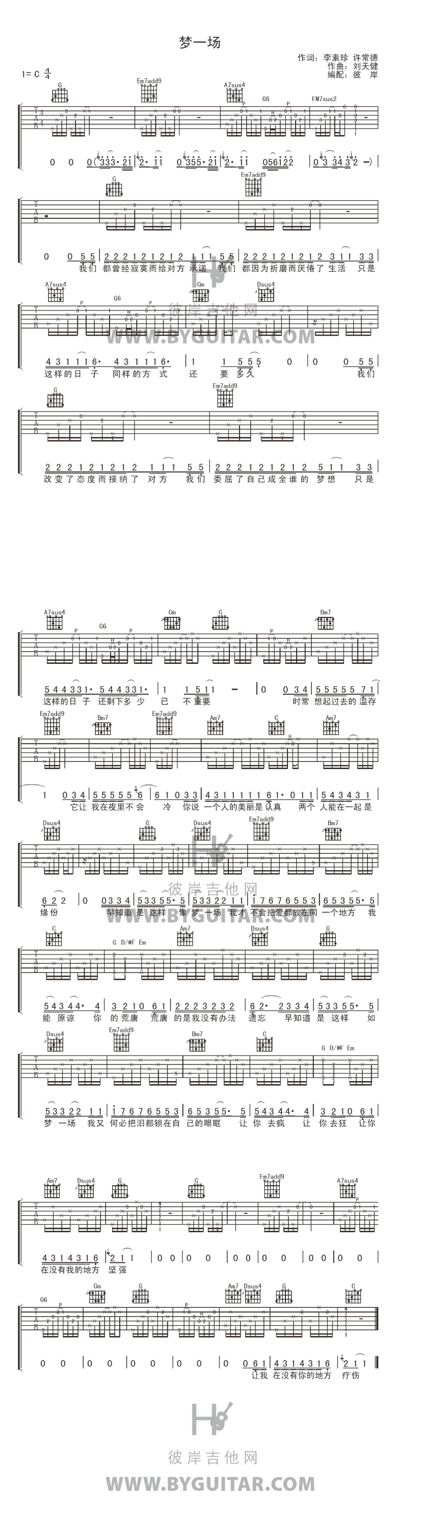 曲谱介绍: 梦一场吉他谱原唱是那英的版本,也是一首非常非常适合吉他弹奏的歌曲了,这个版本是老萧的版本,选用C调编配,如果女生版可以尝试变调夹到3-4品。