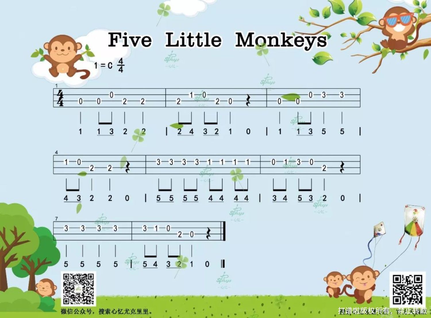 曲谱介绍: 学习音乐是一个浸润的过程,音乐不只听歌,唱歌,它还有节奏、节拍、律动、舞蹈、戏剧表演、绘画、乐器还有语言等;音乐是一门艺术性、综合性很强的学科,是一种极富感染力的艺术形式。学习音乐对我们孩子的好处数不胜数。 亲子音乐,重亲子陪伴,这是给家长看的学习视频,家长学会了去教孩子。一首歌的玩法很多,这首歌的课程内容至少要花一个月时间和孩子玩,同一首歌的不同玩法适合不同年龄阶段。 我们不只是学会这首歌里面的英文句子,而是通过学习这首歌,给孩子英语启蒙并引导孩子的兴趣,通过故事,戏剧表演,手工,画画,弹琴等培养和开发孩子的想象力,创造力,锻炼语言表达能力,精细化动作,运动能力等;通过恒拍学习,尤克里里弹奏等音乐学习培养孩子的感性思维, 锻炼孩子的听觉能力,乐感和节奏感等。 PS:这首歌还有一个功能,从五只到一只小猴子,数字递减,也是在给孩子做数学启蒙。   第一部分:3-6岁综合能力培养 内容简介:1.弹唱演奏,2.故事引导弹唱演奏,3.修改歌词+戏剧表演+手工【纸偶和面具】,4.画画《培养孩子从画画开始》,5.歌词发音讲解;   第二部分:3-5岁恒拍练习 内容简介:稳定的节奏是学习音乐的基础。  通过恒拍练习更好的锻炼孩子节奏感的稳定性。   第三部分:5-8岁弹唱指弹教程 内容简介1.节奏动作手势,四分音符跺脚,八分音符拍手两下,休止符嘘,在认知乐理前先让孩子感知区别;2.弹唱教程;3.跳音阶图和指弹教程。   弹唱指弹曲谱 百度网盘链接:https://pan.baidu.com/s/1U1jqmZUNVTRd2wZqaWFDsQ 密码: etmg