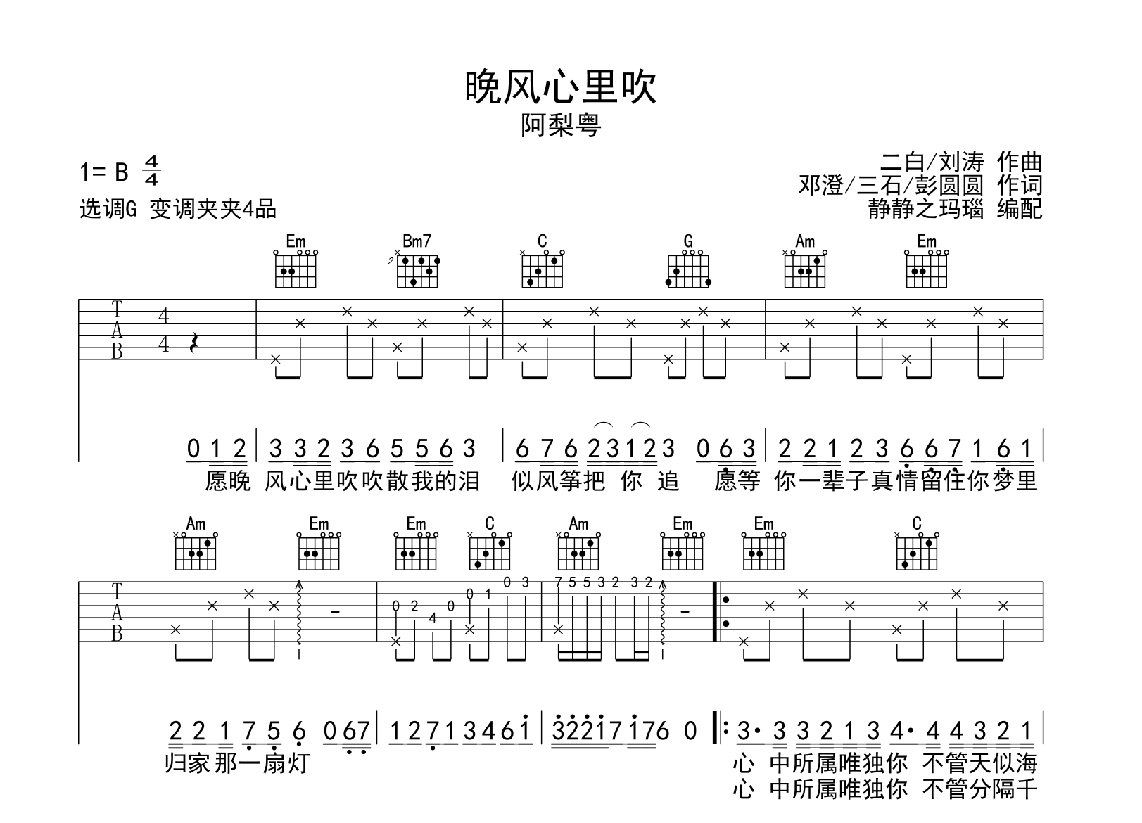 曲谱介绍: 阿梨粵《晚风心里吹》吉他谱,由@静静之玛瑙制谱,《晚风心里吹》吉他弹唱谱,共两张图片谱,本谱采用G调和弦指法编配,原调B调,节奏4/4拍,曲速95拍每分钟,弹唱建议变调夹夹4品,指法简单。